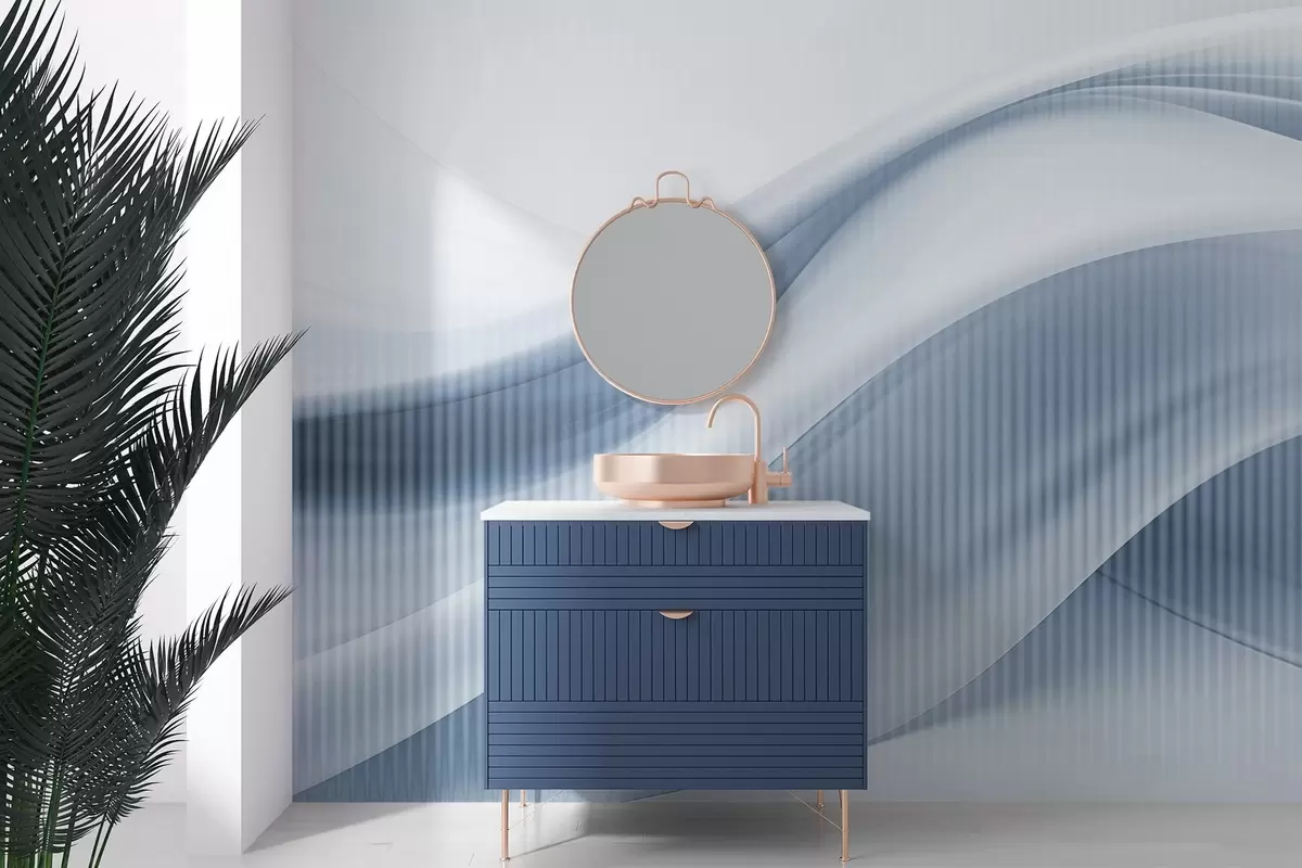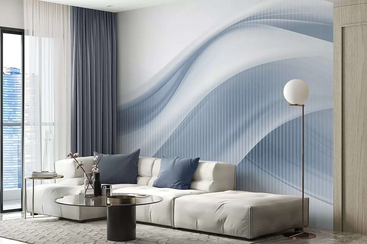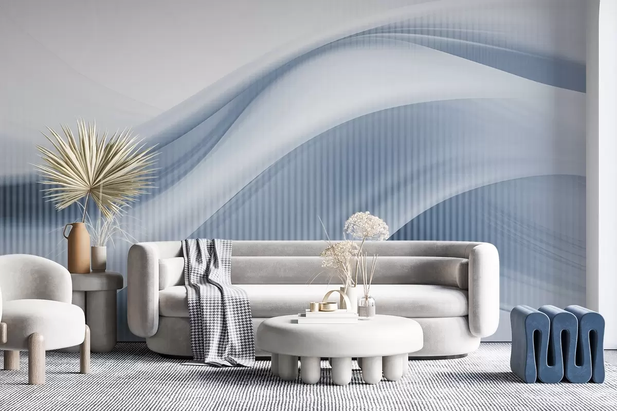 Fototapet Abstrakt tryck med böljande linjer och subtila vertikala ränder som skapar en känsla av rörelse och djup, blå palett Nr. w09189v1