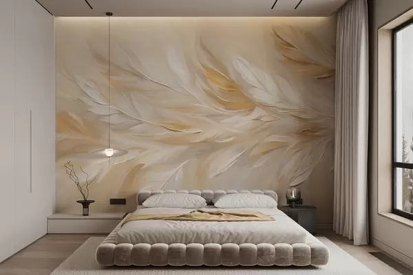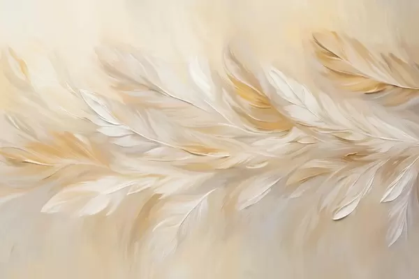 Fototapet Vita och beige fjädrar arrangerade i ett flödande mönster, mjuk textur, varm färgpalett, abstrakt bakgrund Nr. w09191