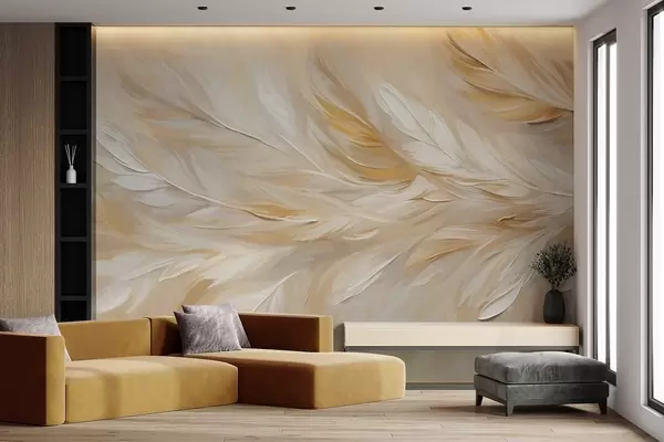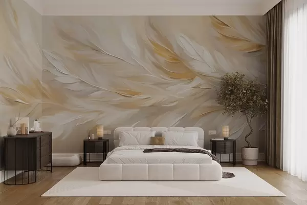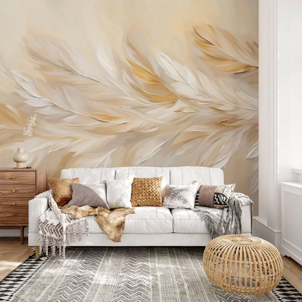 Fototapet Vita och beige fjädrar arrangerade i ett flödande mönster, mjuk textur, varm färgpalett, abstrakt bakgrund Nr. w09191