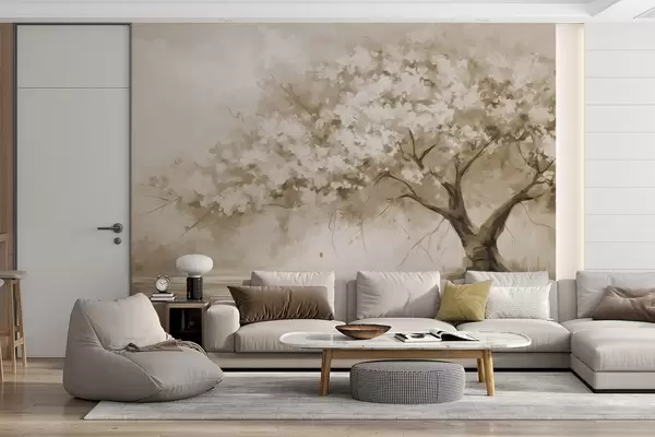 Fototapet Abstrakt beige blommande träd i full blom, bredvid en flod, mjuka texturerade penseldrag och pastellfärger Nr. w09193v1