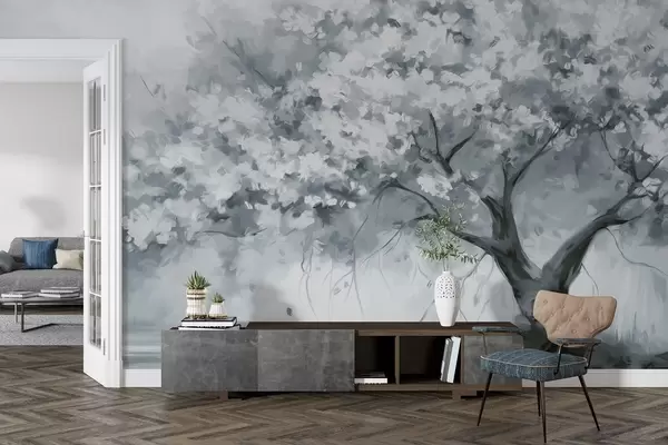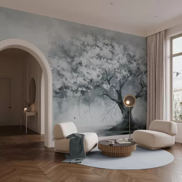 Fototapet Abstrakt blåblommigt träd i full blom, intill en flod, mjuka texturerade penseldrag och pastellfärger Nr. w09193v2
