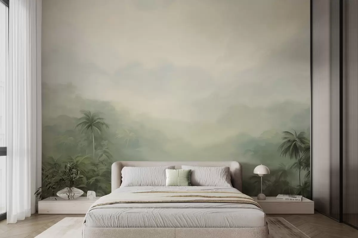 Fototapet Gungle landskap med frodiga gröna palmer och böljande kullar, mjuka pastellfärger, texturerad målningsimitation Nr. w09194