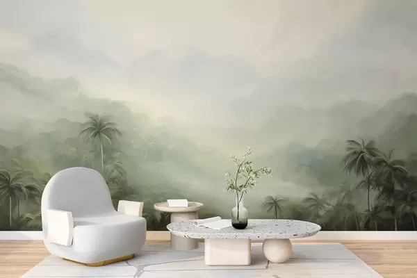 Fototapet Gungle landskap med frodiga gröna palmer och böljande kullar, mjuka pastellfärger, texturerad målningsimitation Nr. w09194