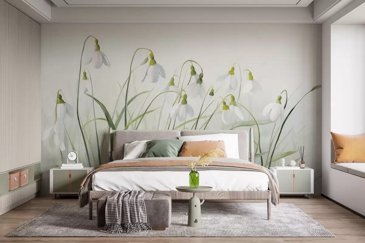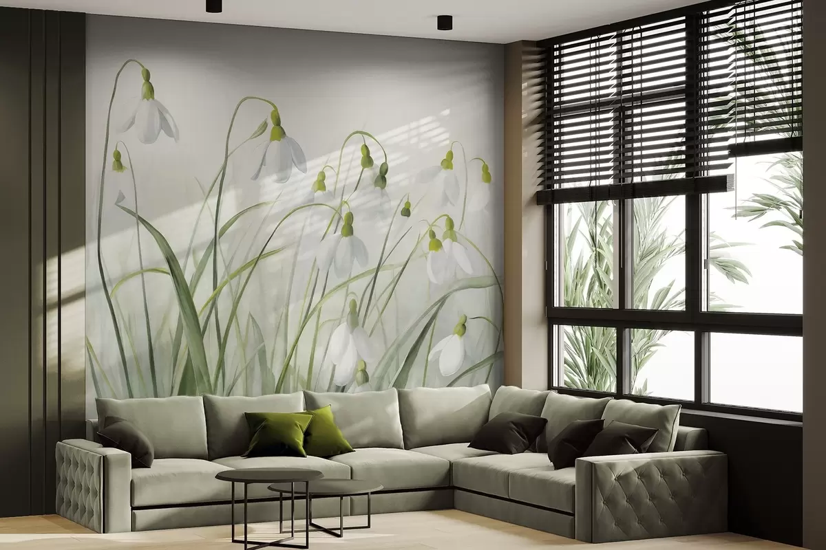 Fototapet Snödroppsblommor med gröna texturerade stjälkar och blad, akvarell vårstil, fina penseldrag Nr. w09195