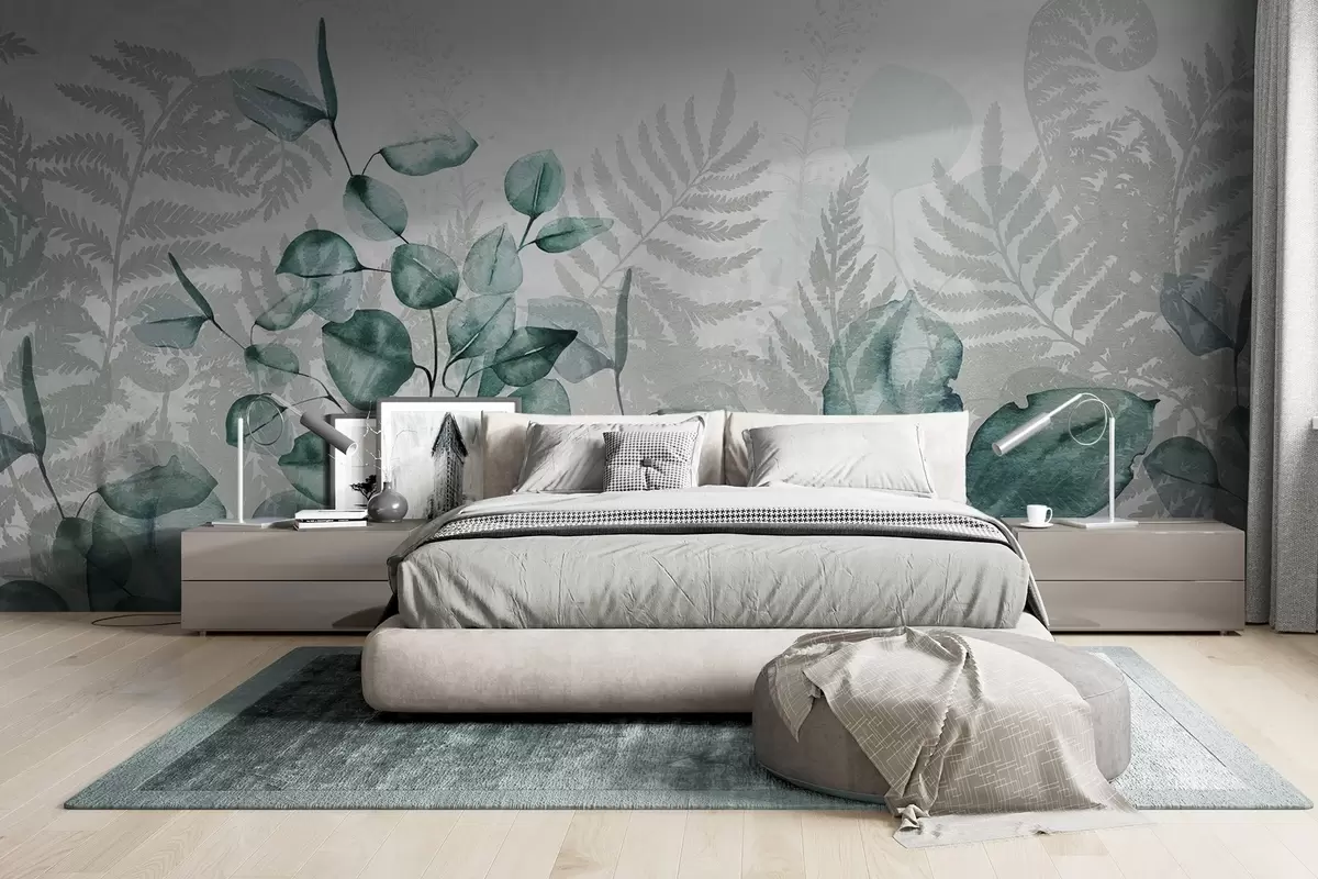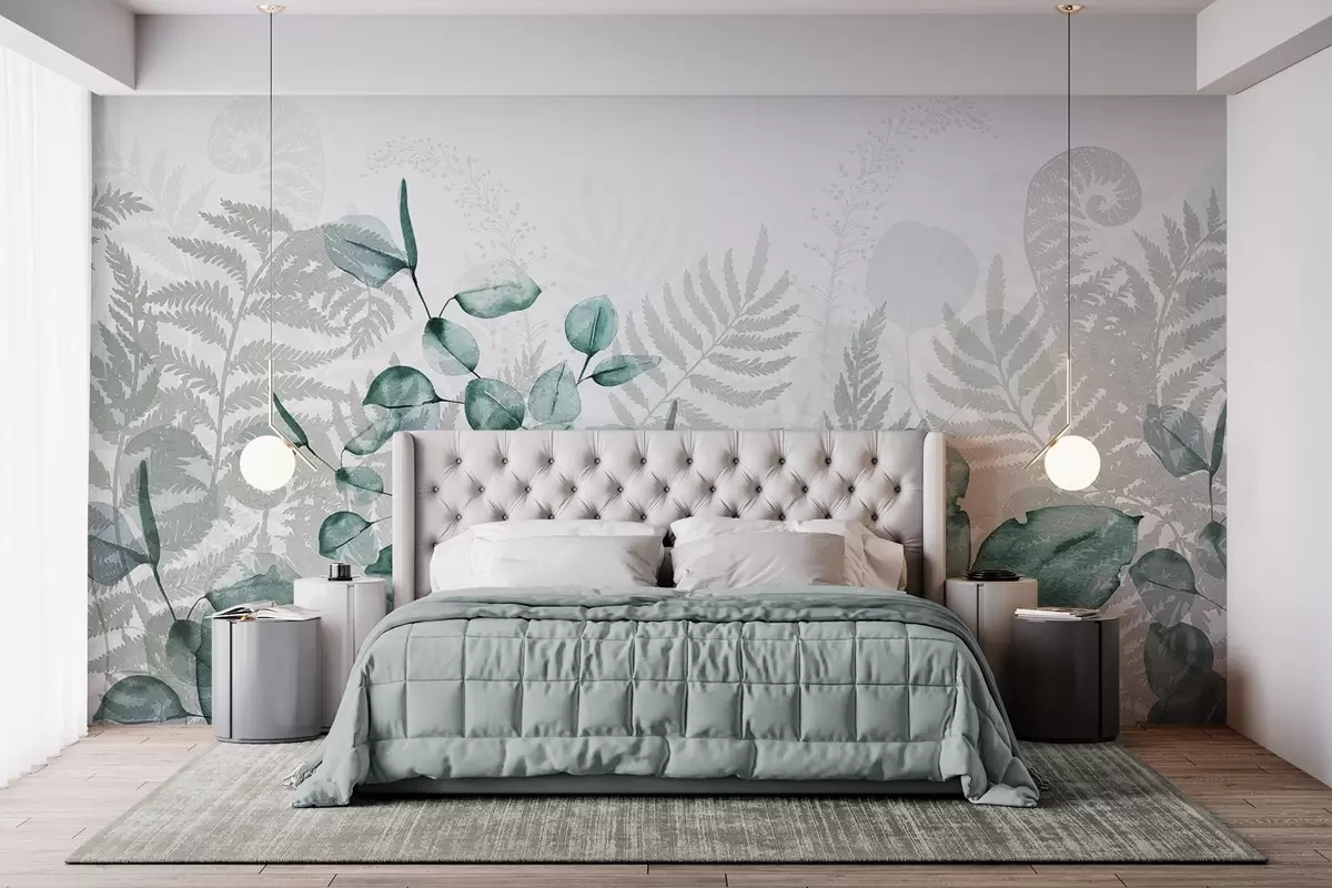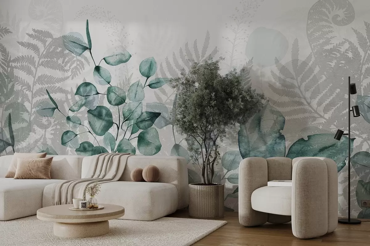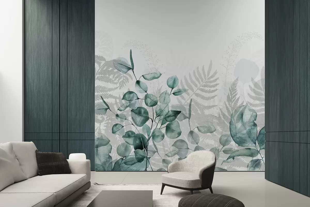 Fototapet Eukalyptus- och ormbunksblad i nyanser av grönt och grått, akvarelleffekt, botanisk illustration Nr. w09197