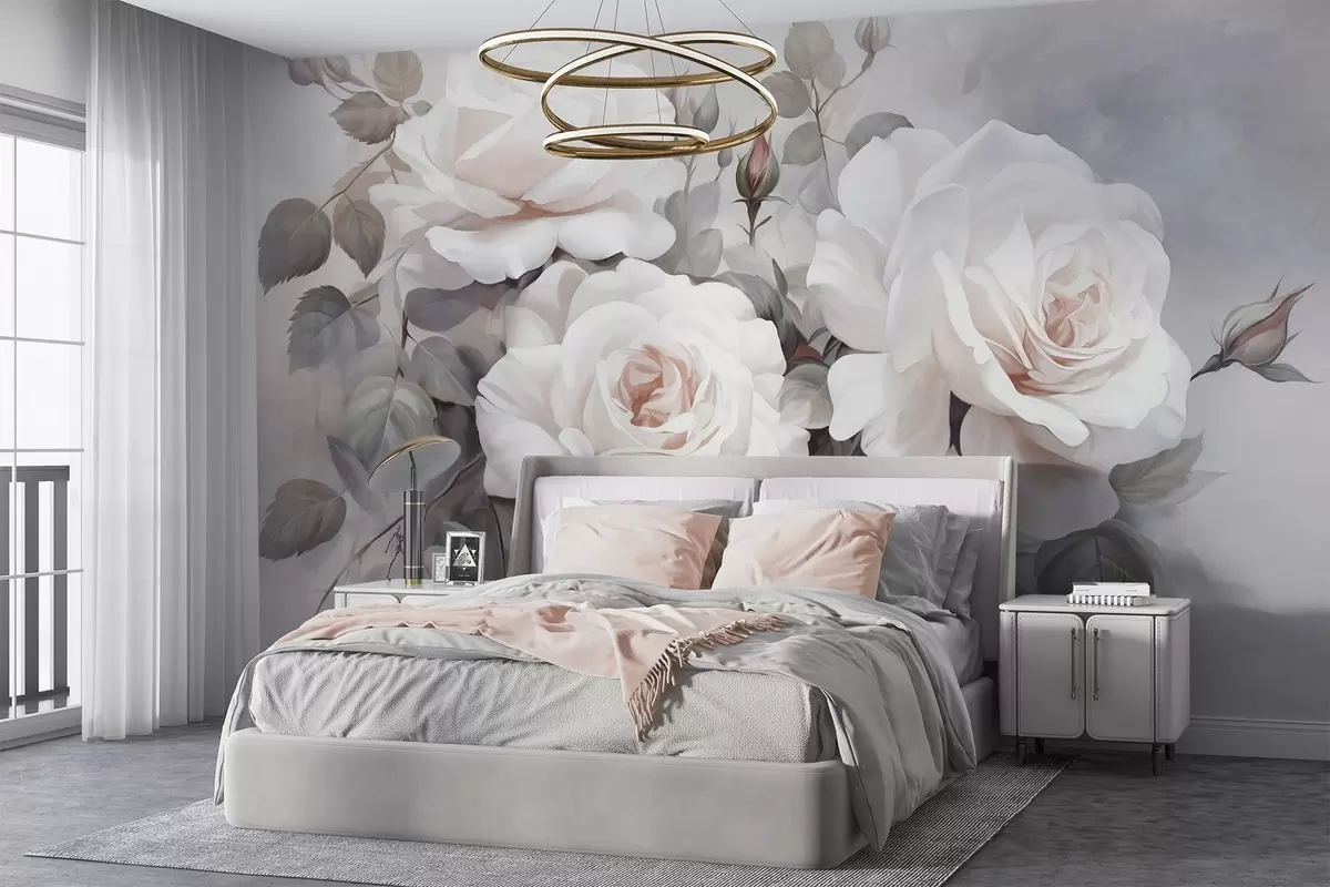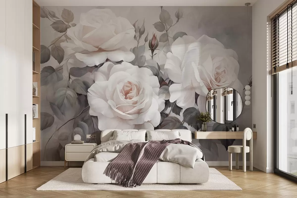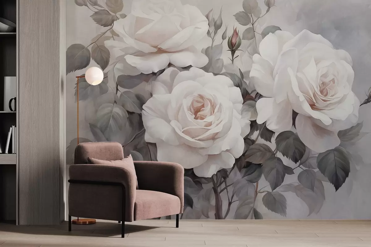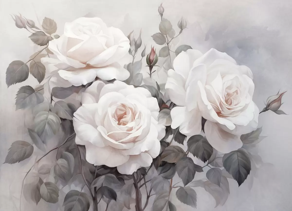 Fototapet Strukturerade vita rosor med blad och stjälkar, mjuka dämpade pastellfärger, elegant vintagestil, fina penseldrag Nr. w09198