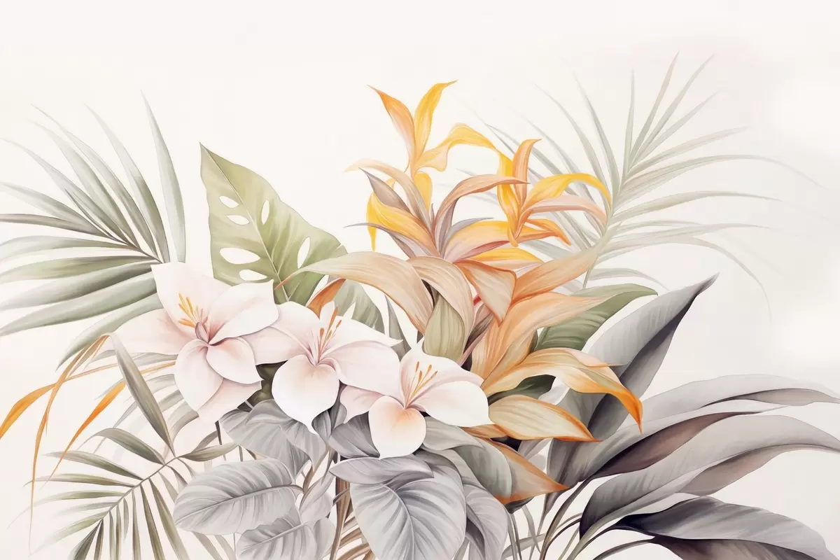 Fototapet Botanisk illustration av tropiska blommor med palm- och monsterablad, mjuka färger, akvarellstil Nr. w09201