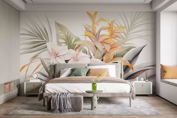 Fototapet Botanisk illustration av tropiska blommor med palm- och monsterablad, mjuka färger, akvarellstil Nr. w09201