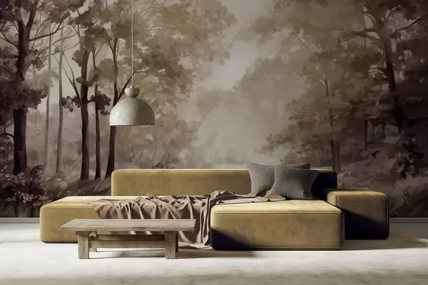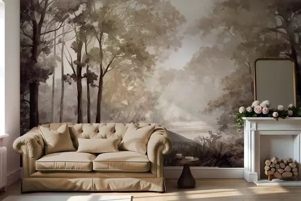 Fototapet Strukturerat skogslandskap, träd med beige och bruna blad, pastellfärgad palett Nr. w09210