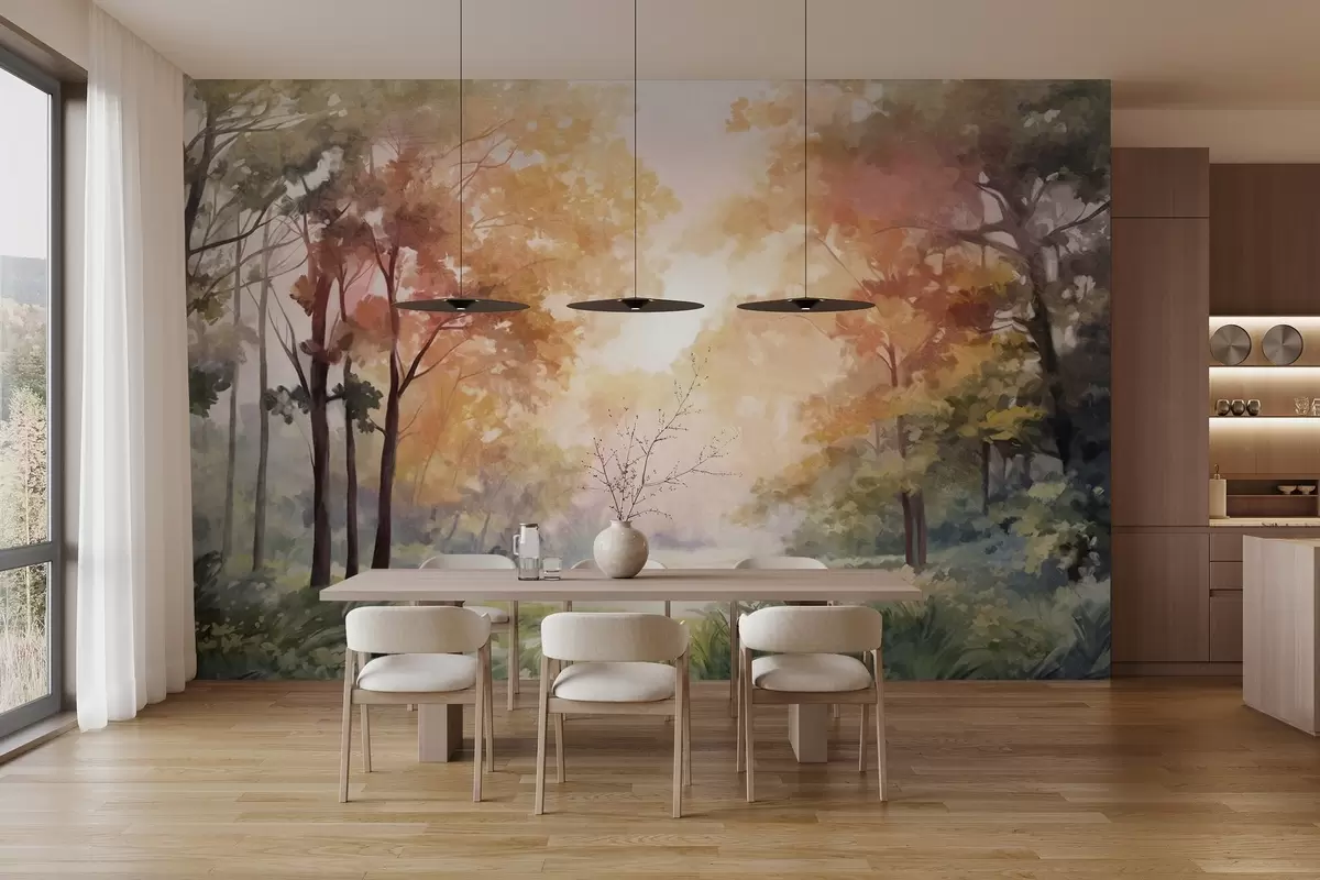 Fototapet Strukturerat skogslandskap, träd med orange och gröna blad, pastellfärgad palett Nr. w09210v1