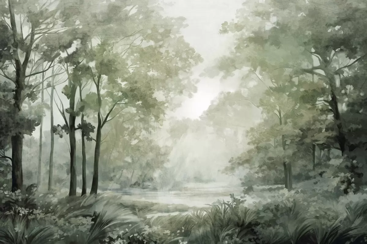 Fototapet Strukturerat skogslandskap, träd med gröna blad, pastellfärgpalett Nr. w09210v2