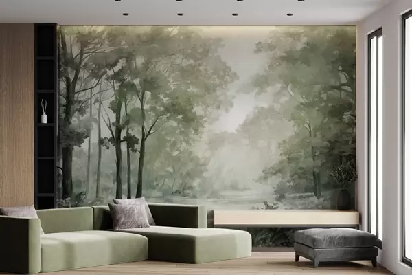 Fototapet Strukturerat skogslandskap, träd med gröna blad, pastellfärgpalett w09210v2