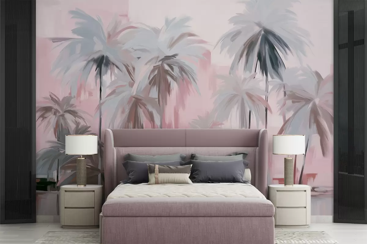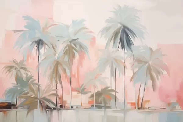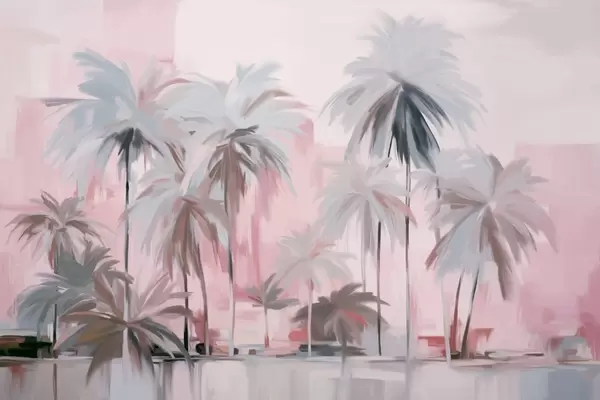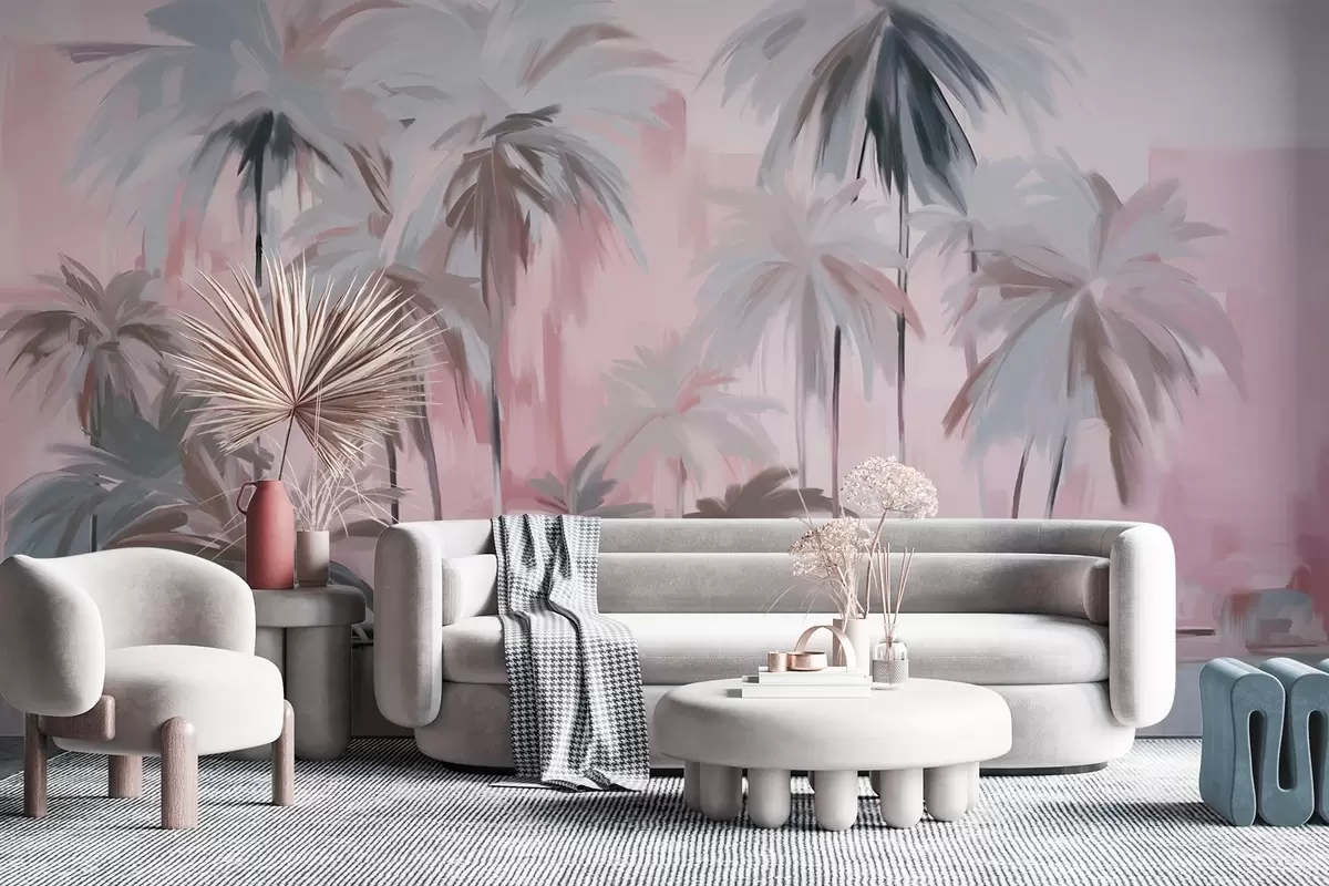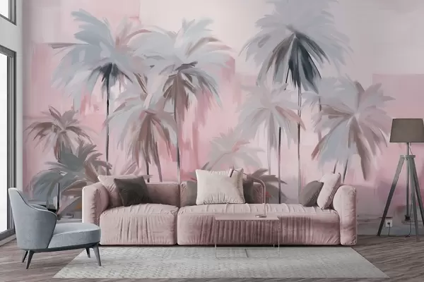 Fototapet Abstrakta minimalistiska pastellfärgade tropiska palmer mot en bakgrund av dämpade rosa och grå nyanser Nr. w09212v1