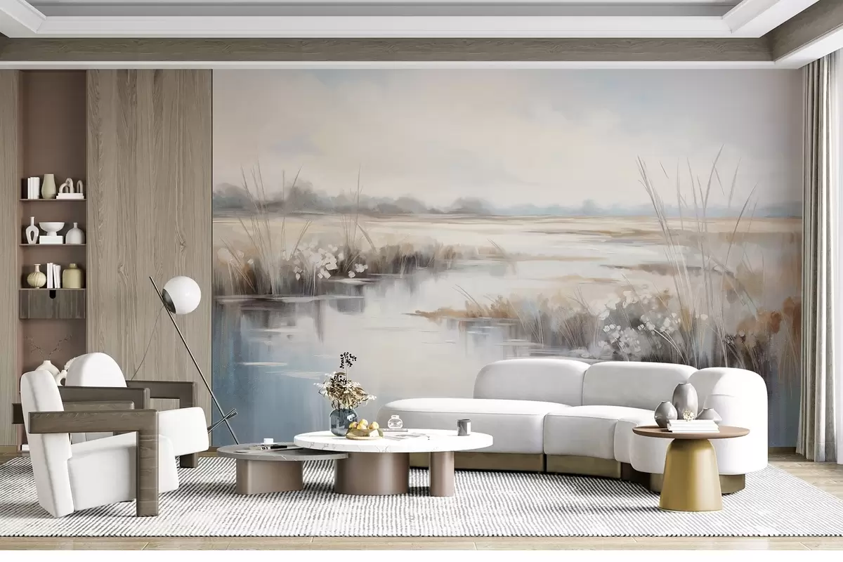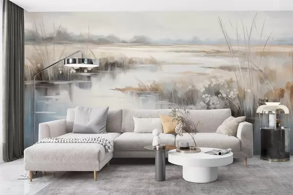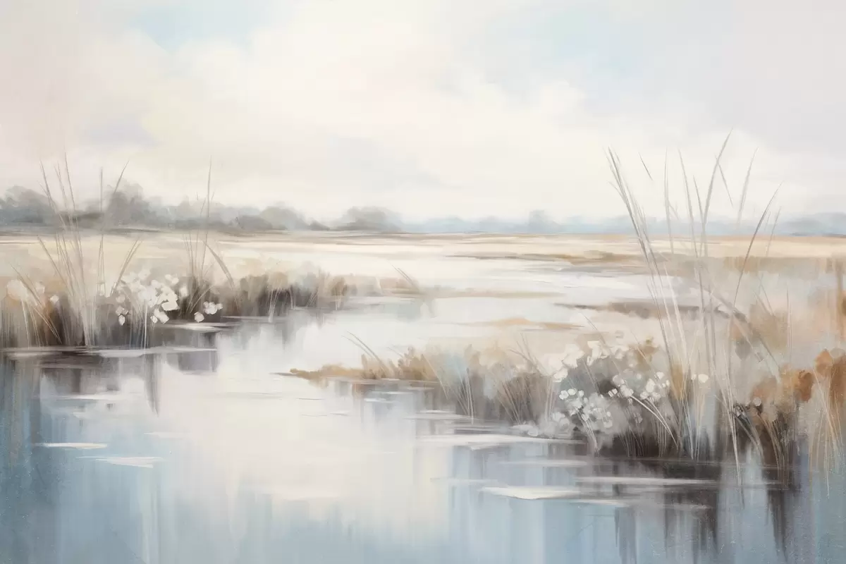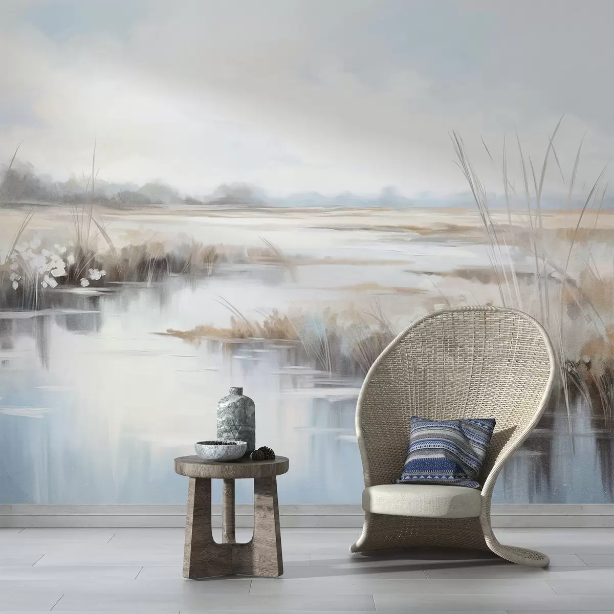 Fototapet Texturerat lugnt landskap med högt gräs och lugnt vatten, mjuka pastellfärger, avlägsna träd i horisonten Nr. w09213