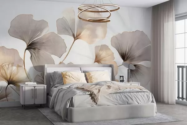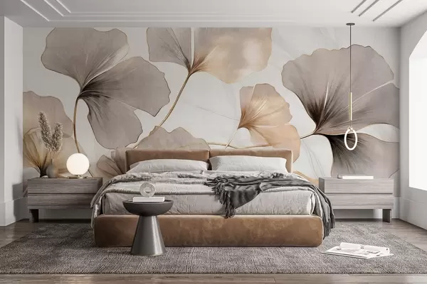 Fototapet Ginkgo biloba-blad i beige, gula och bruna toner, skir texturerad akvarelleffekt, ljus bakgrund Nr. w09215