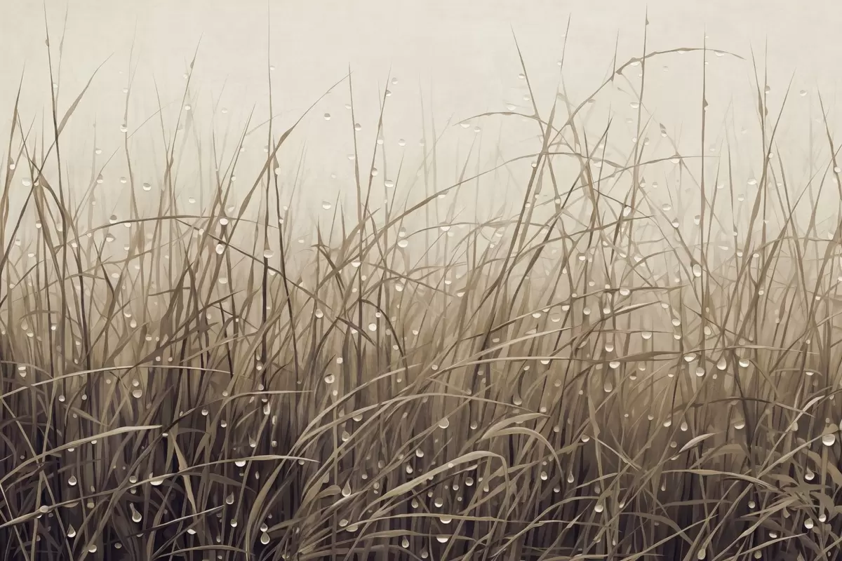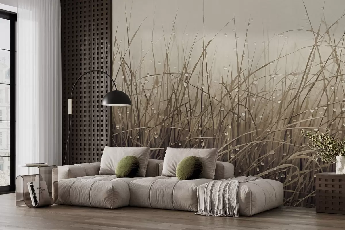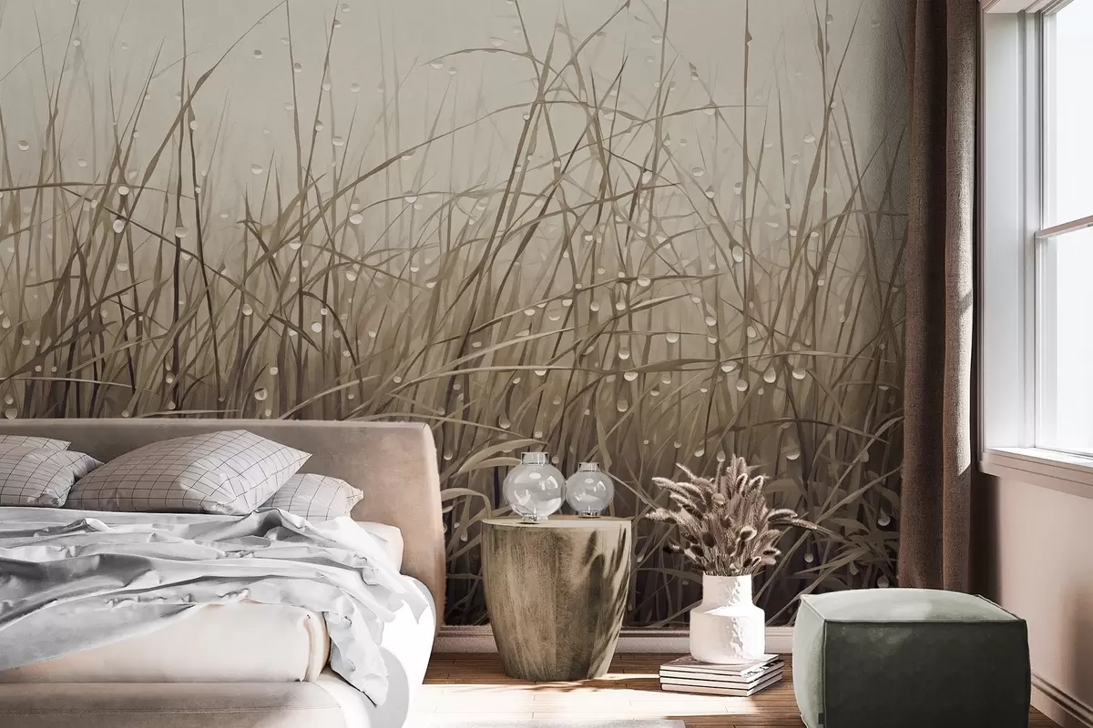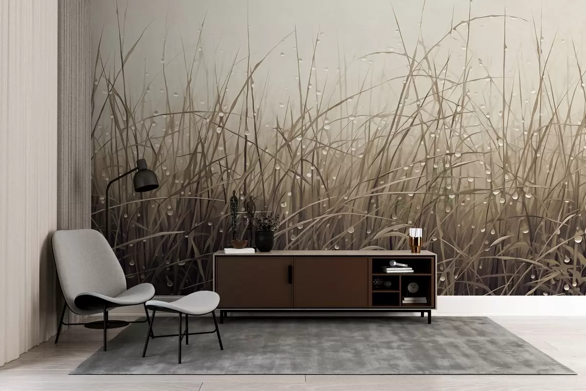 Fototapet Gräs med vattendroppar, dämpade bruna nyanser, mjukt ljus, dimmig bakgrund, abstrakt minimalistisk texturerad stil Nr. w09217v1