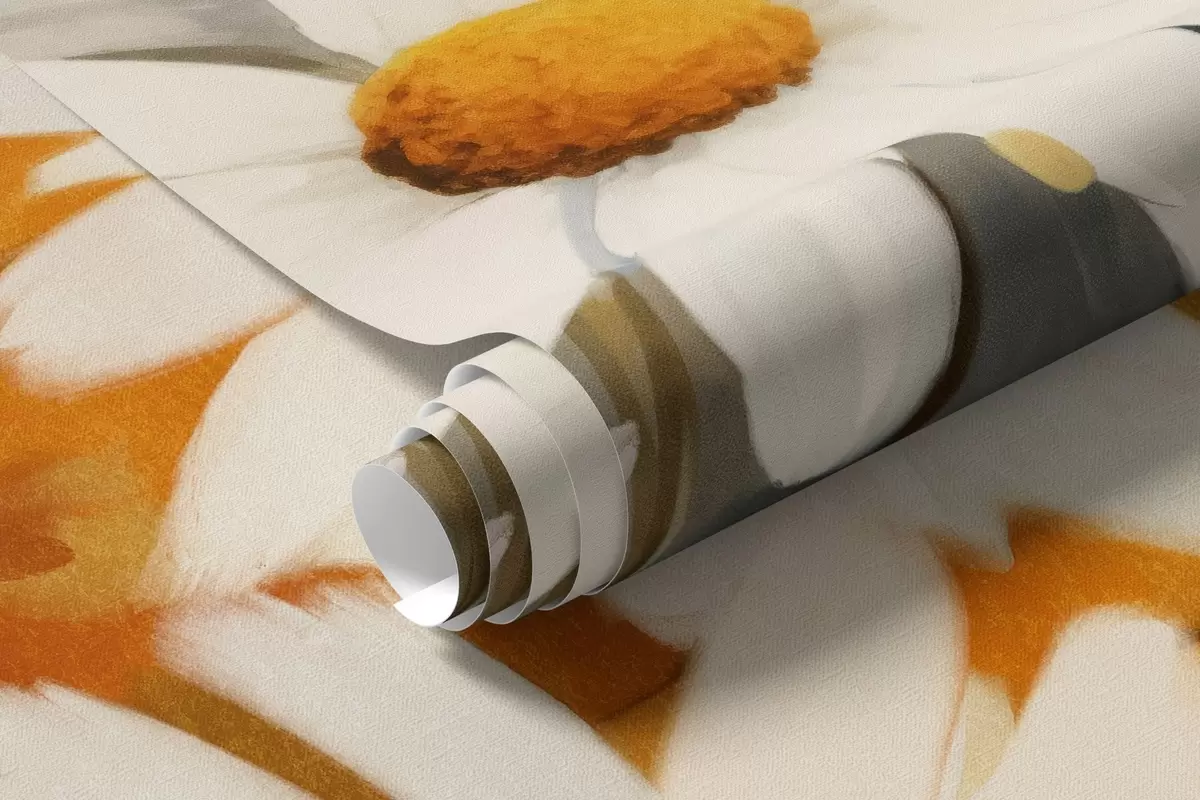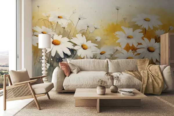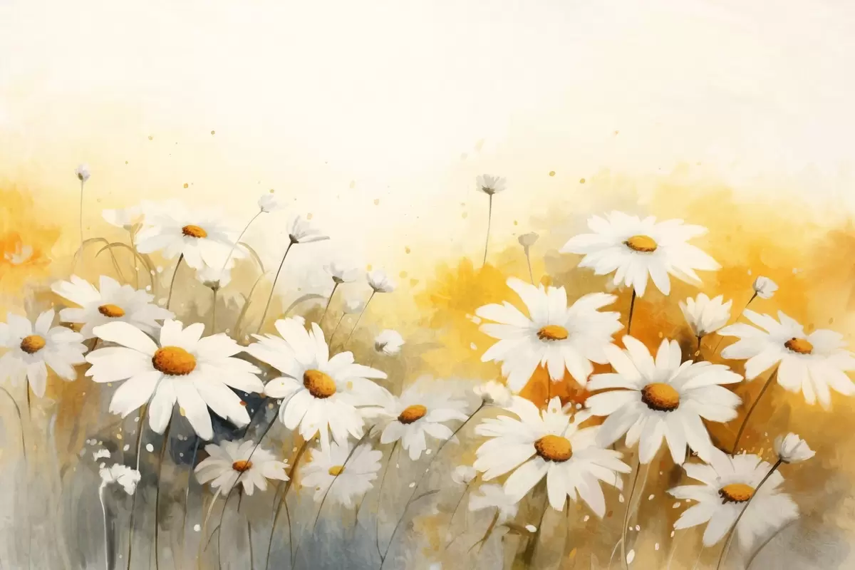 Fototapet Ett fält med vita prästkragar med gul mitt, mot en mjuk gul och beige bakgrund, akvarellstil Nr. w09218