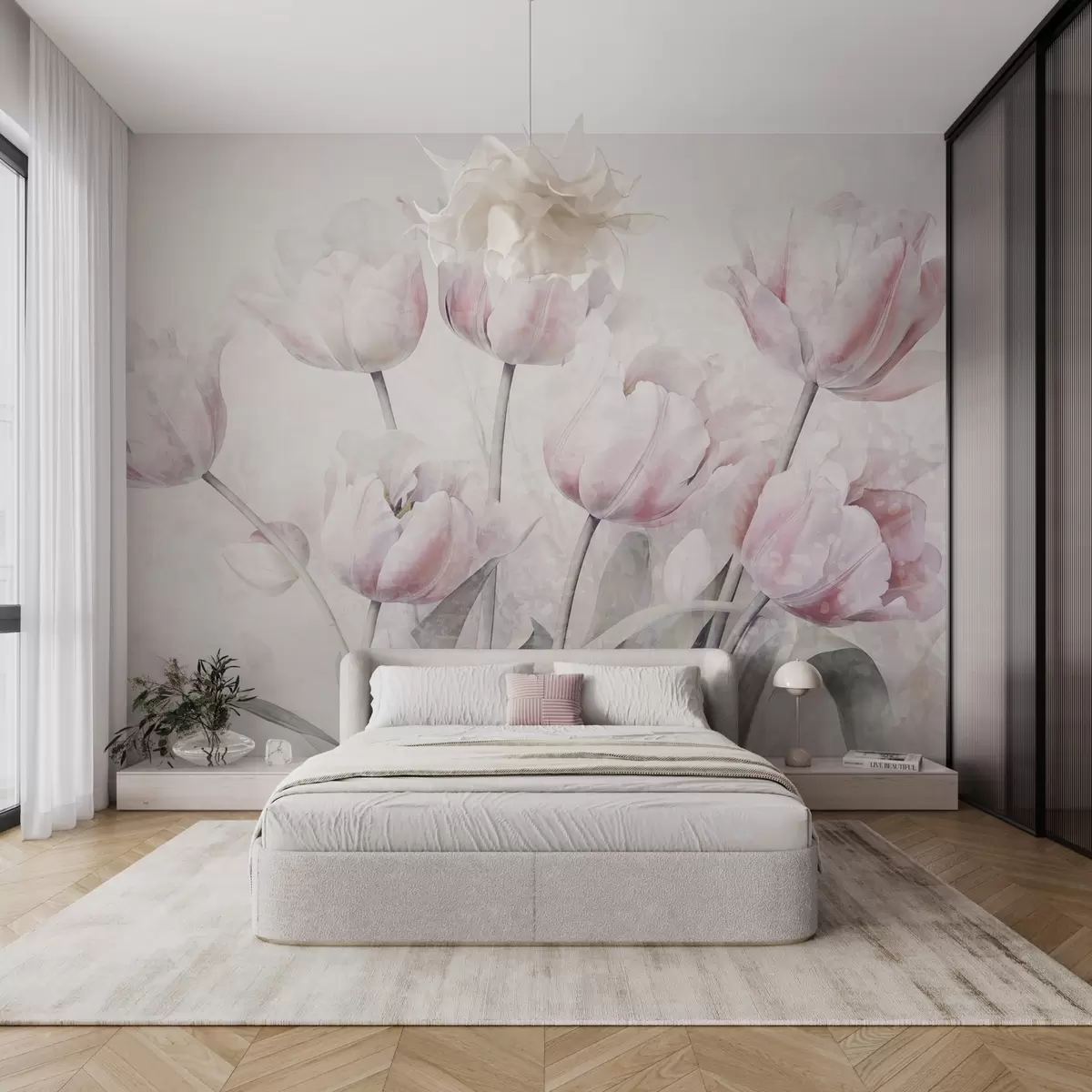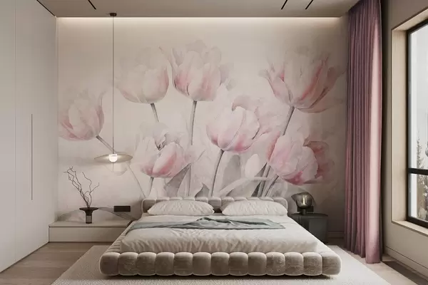 Fototapet Rosa texturerade tulpaner med gröna blad, mjukt ljus, vintage akvarellstil, fina penseldrag Nr. w09220