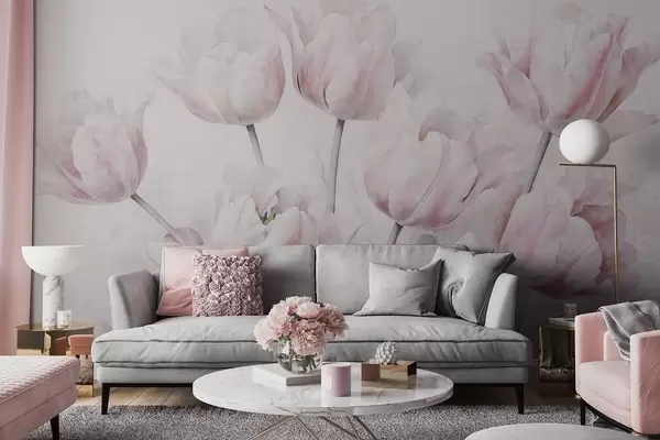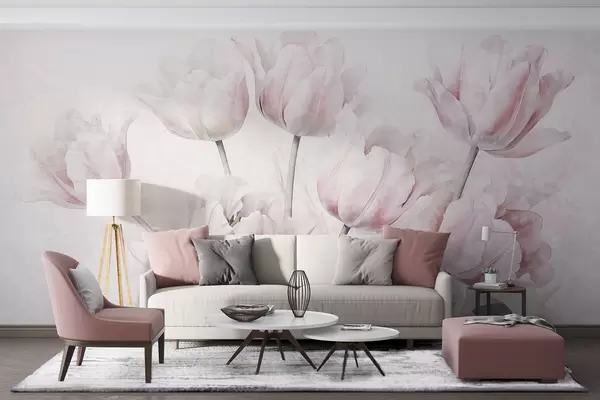 Fototapet Rosa texturerade tulpaner med gröna blad, mjukt ljus, vintage akvarellstil, fina penseldrag Nr. w09220