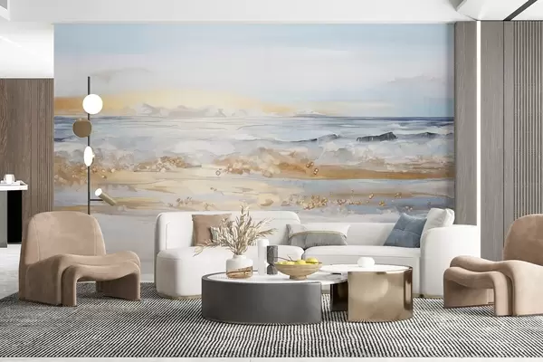 Fototapet Abstrakt texturerat landskap havsvågor som slår på en sandstrand, mjuka pastellfärger, blå himmel med lätta moln Nr. w09234