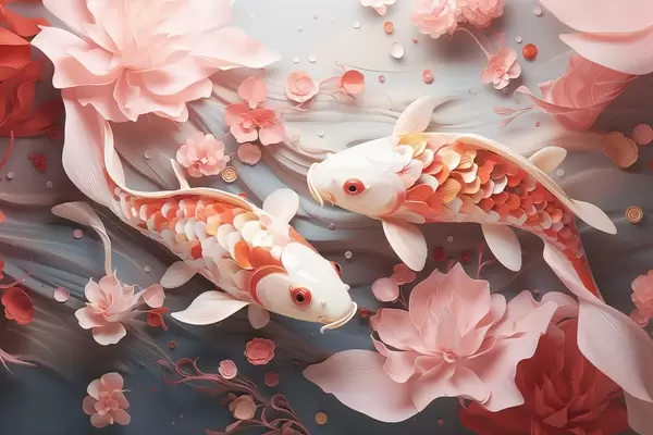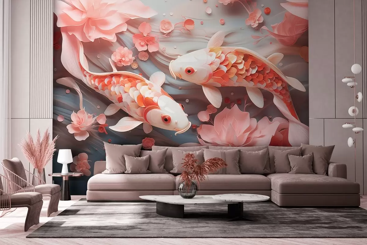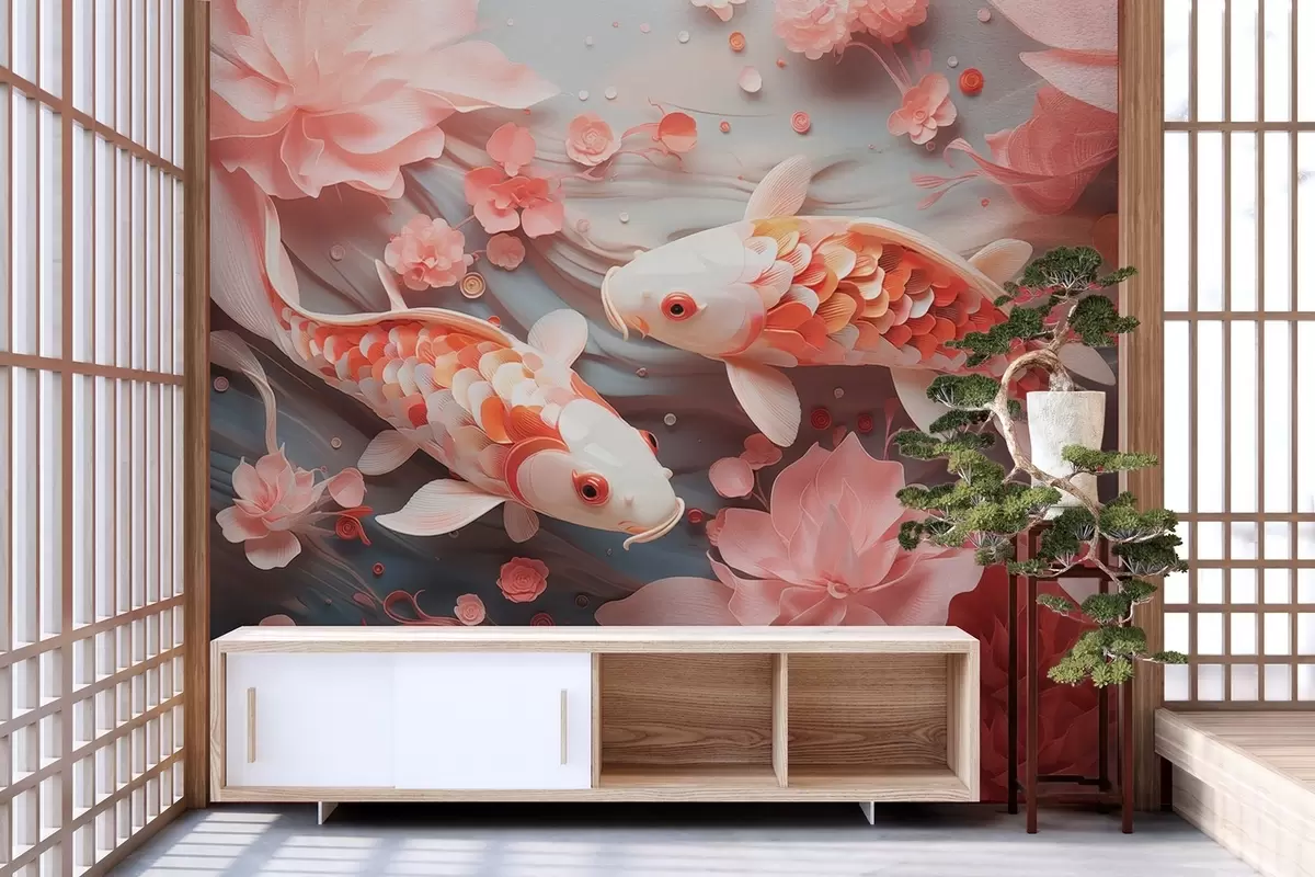 Fototapet Delikata fiskar med dimensionella fjäll simmar genom ett flöde av kronblad och mjuka rosa toner Nr. w09237
