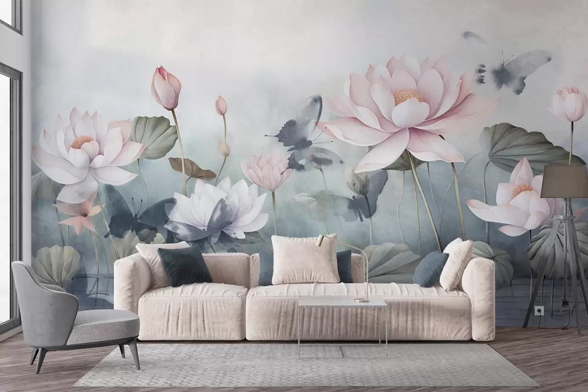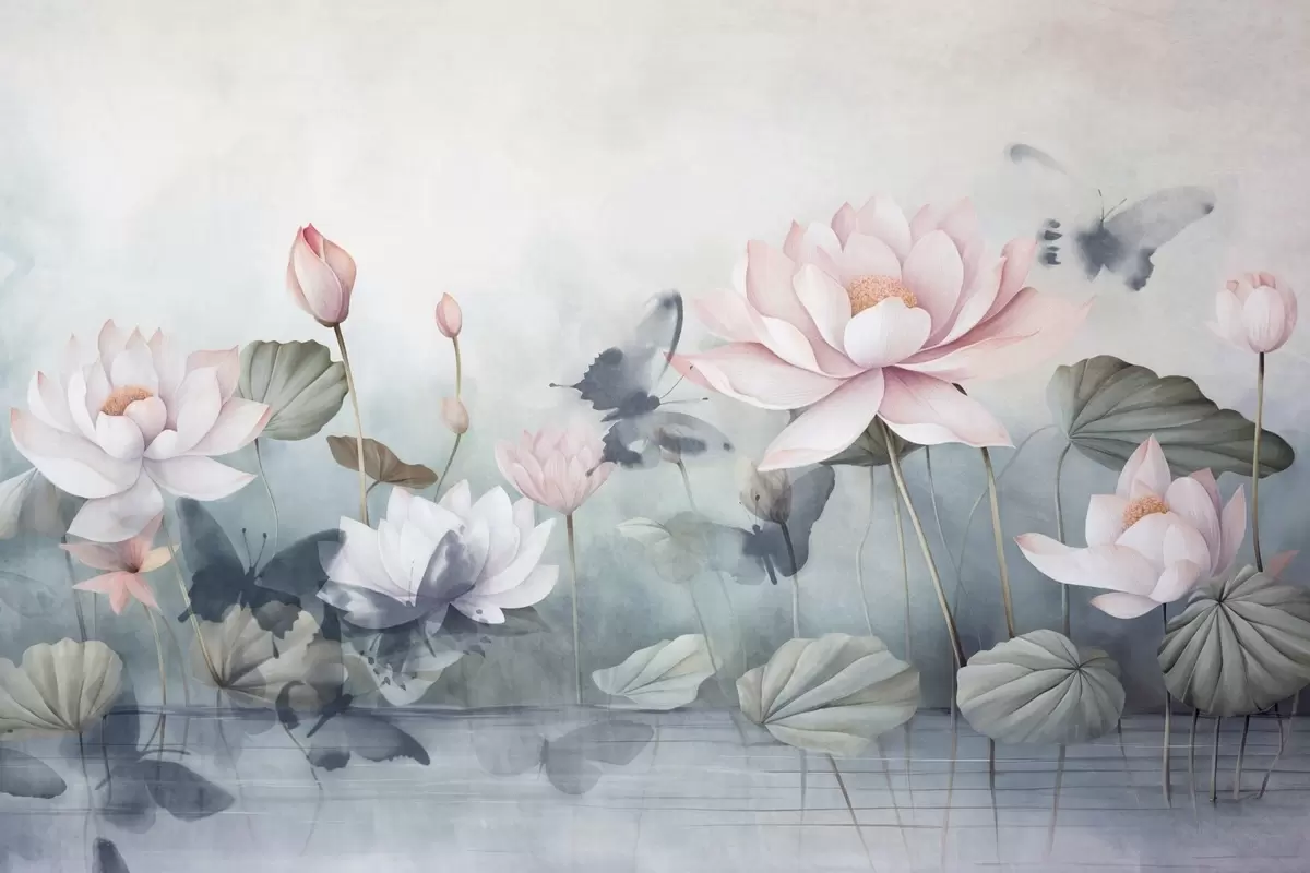 Fototapet Lotusblommor med rosa pastellfärgade kronblad, gröna blad, vattenreflektion, mjuka pastellfärger, akvarelleffekt Nr. w09254