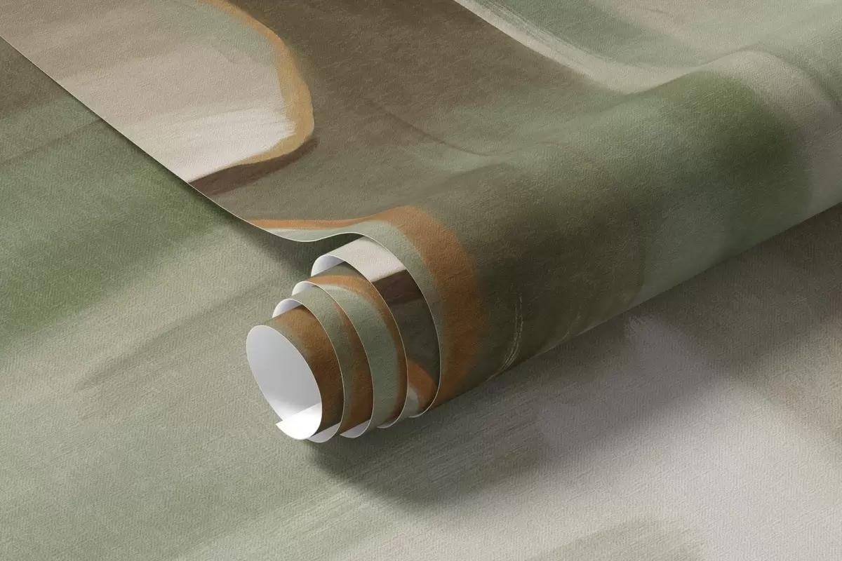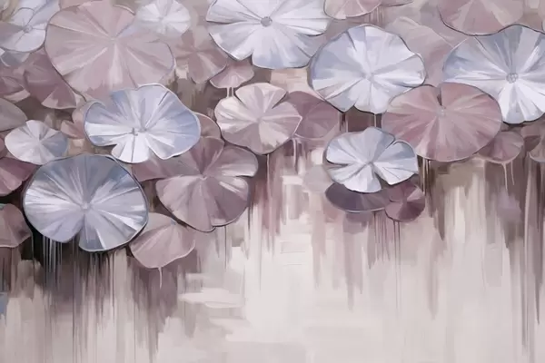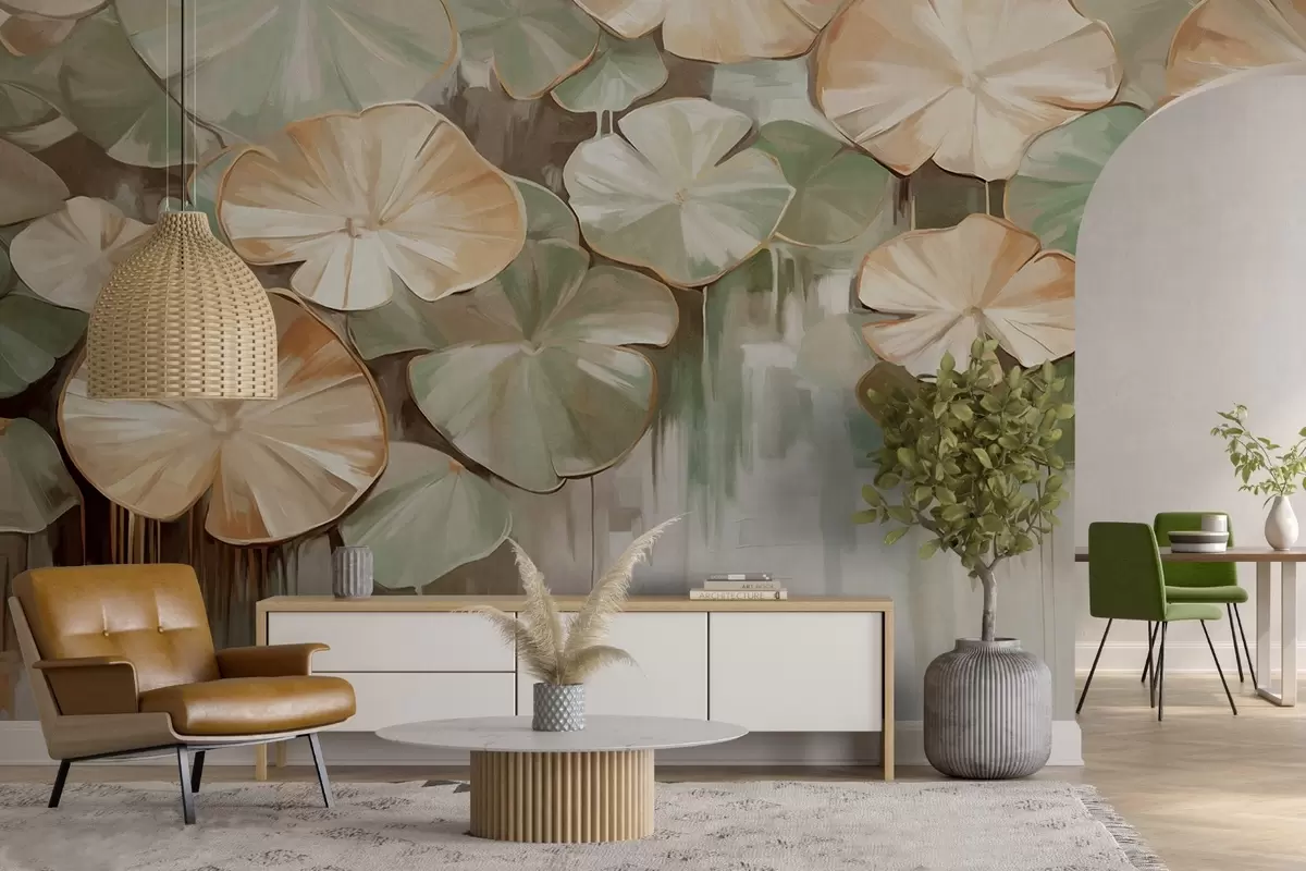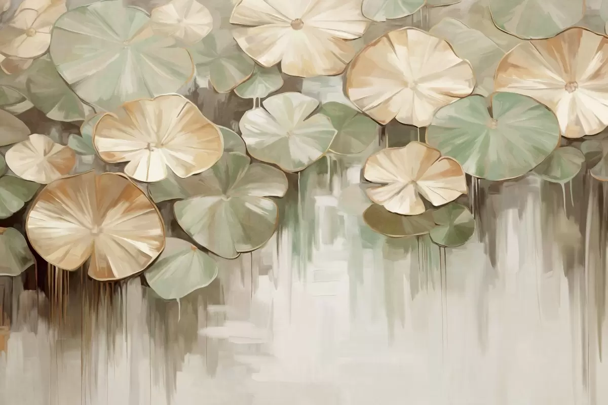 Fototapet Strukturerade näckrosblad med gröna och beige färger i en damm, bakgrunden är en suddig blandning av vitt, grönt och brunt Nr. w09255