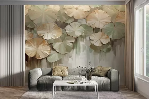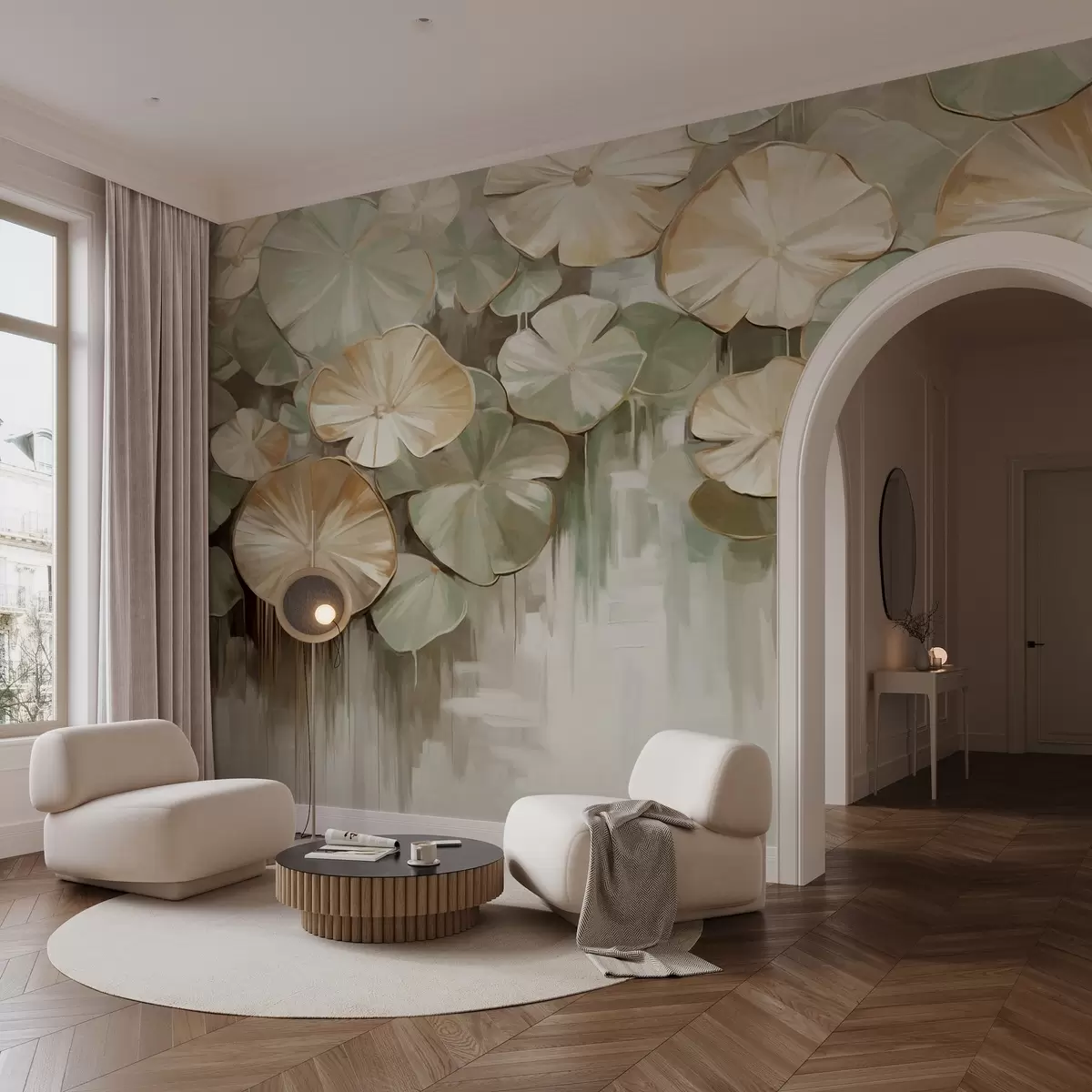 Fototapet Strukturerade näckrosblad med gröna och beige färger i en damm, bakgrunden är en suddig blandning av vitt, grönt och brunt Nr. w09255