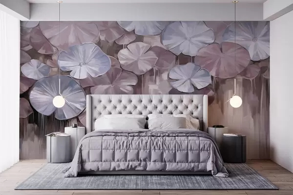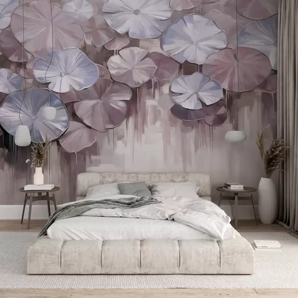 Fototapet Strukturerade näckrosblad med violetta och blå färger i en damm, bakgrunden är en suddig blandning av mjuka nyanser av lila Nr. w09255v1