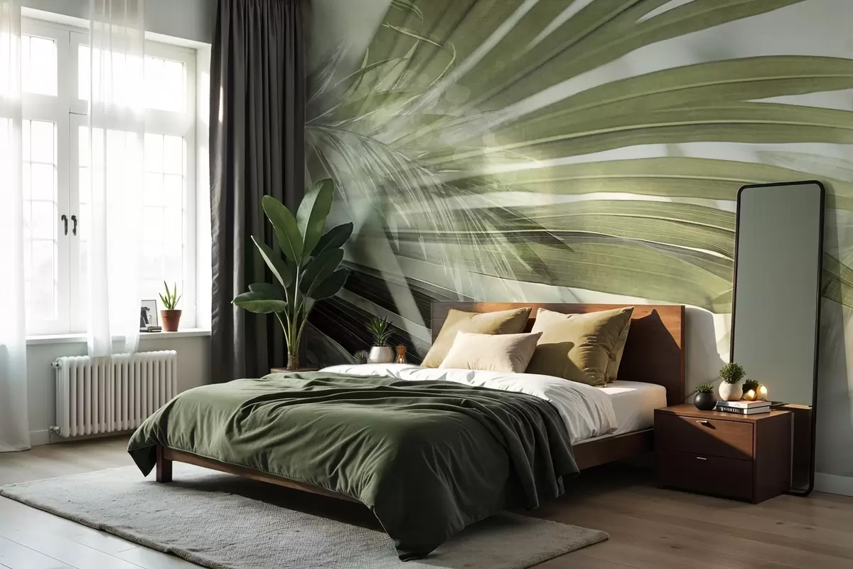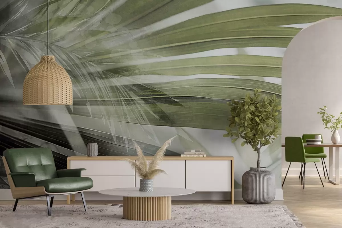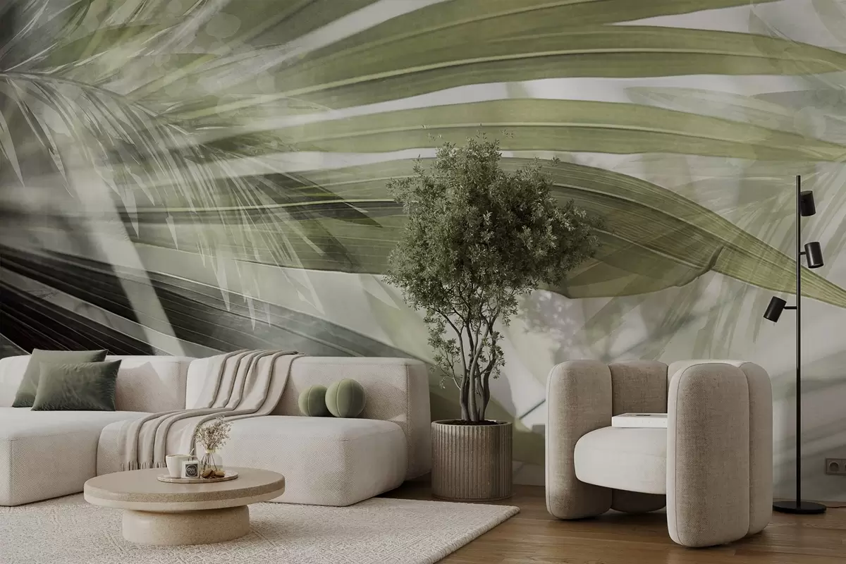 Fototapet Palmblad med en ljusgrön nyans som överlappar varandra och skapar en skiktad effekt, mot en mjuk, neutral bakgrund Nr. w09256v1