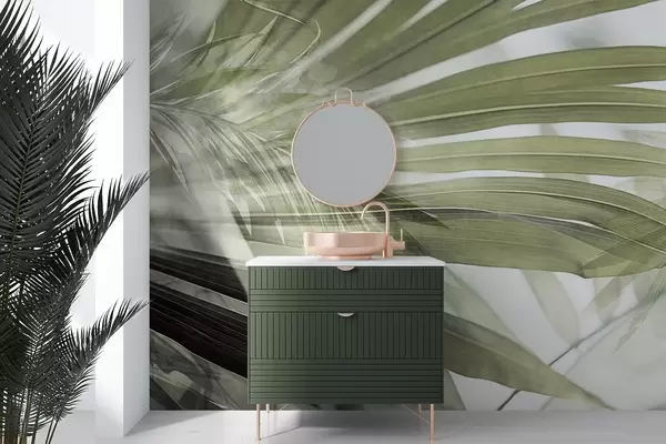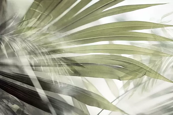 Fototapet Palmblad med en ljusgrön nyans som överlappar varandra och skapar en skiktad effekt, mot en mjuk, neutral bakgrund Nr. w09256v1