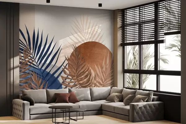 Fototapet Abstrakt texturerad komposition med tropiska blad i blå nyanser och jordnära toner, med en stor cirkulär form Nr. w09257