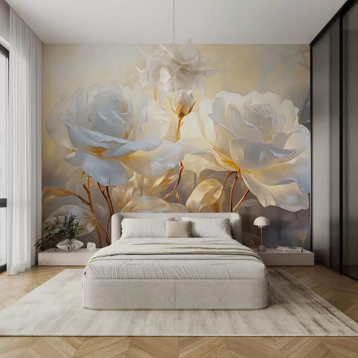 Fototapet Vita texturerade rosor med gula stjälkar och blad, mjuk belysning, ljus bakgrund med suddiga blomformer Nr. w09258
