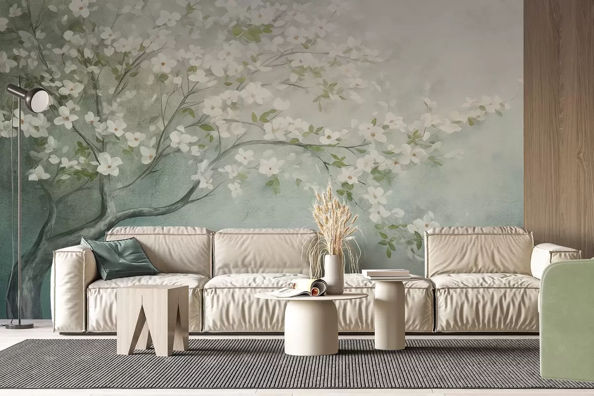 Fototapet Ett blommande träd med vita blommor i full blom, mot en kornig, brusig texturerad bakgrund i dämpat blått och grönt Nr. w09261