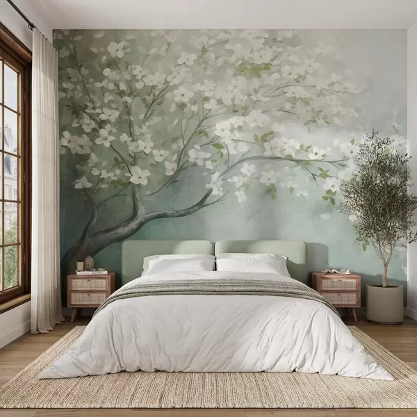 Fototapet Ett blommande träd med vita blommor i full blom, mot en kornig, brusig texturerad bakgrund i dämpat blått och grönt Nr. w09261