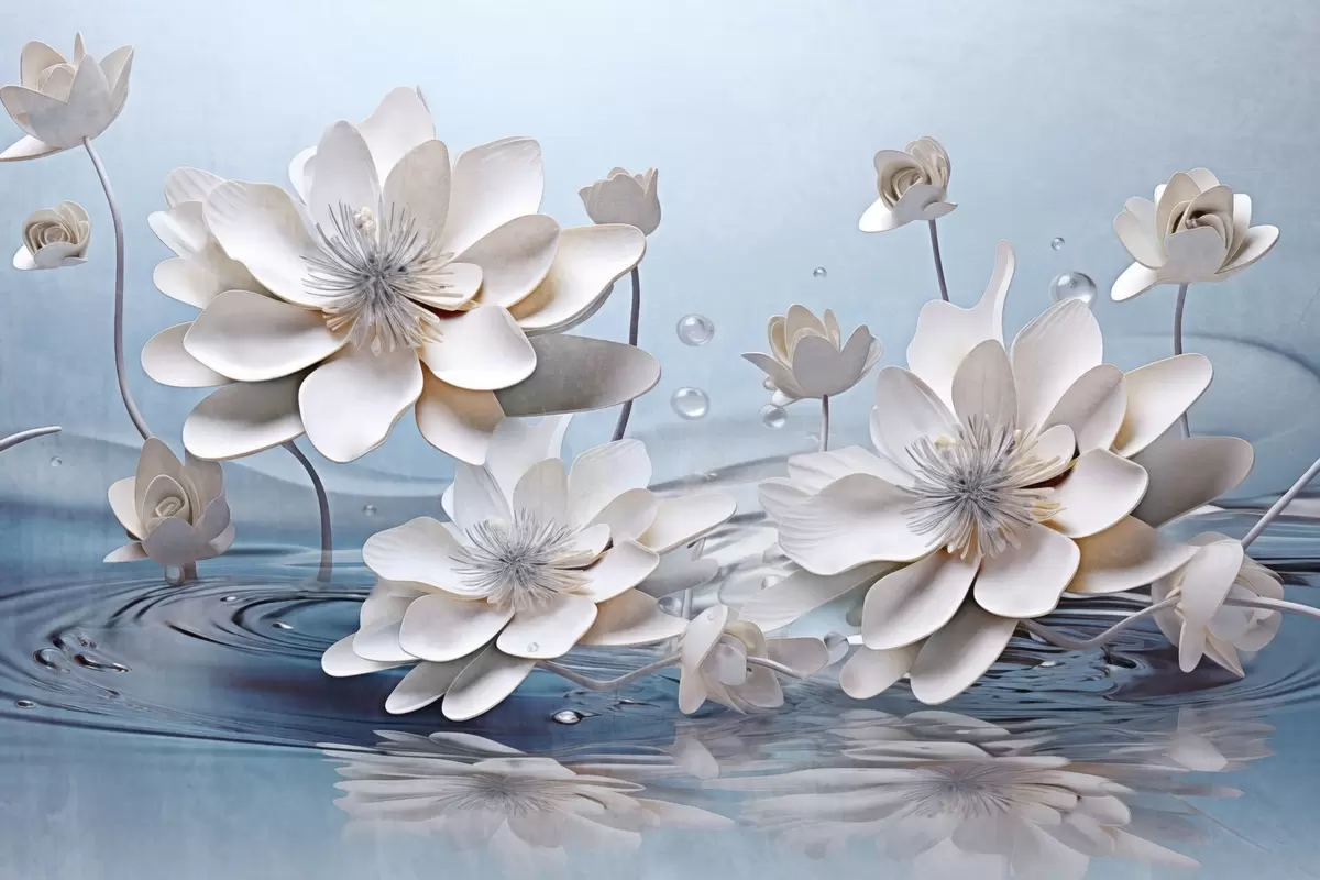 Fototapet Vita texturerade blommor med vattendroppar, reflektioner på vattenytan, ljusblå bakgrund, elegant design Nr. w09262