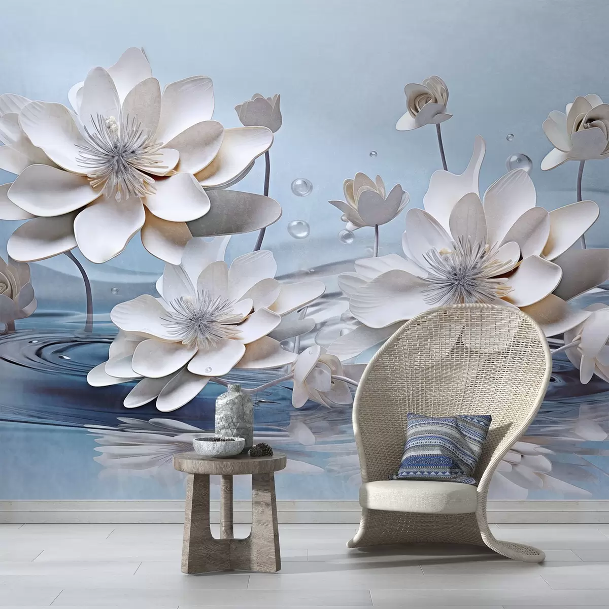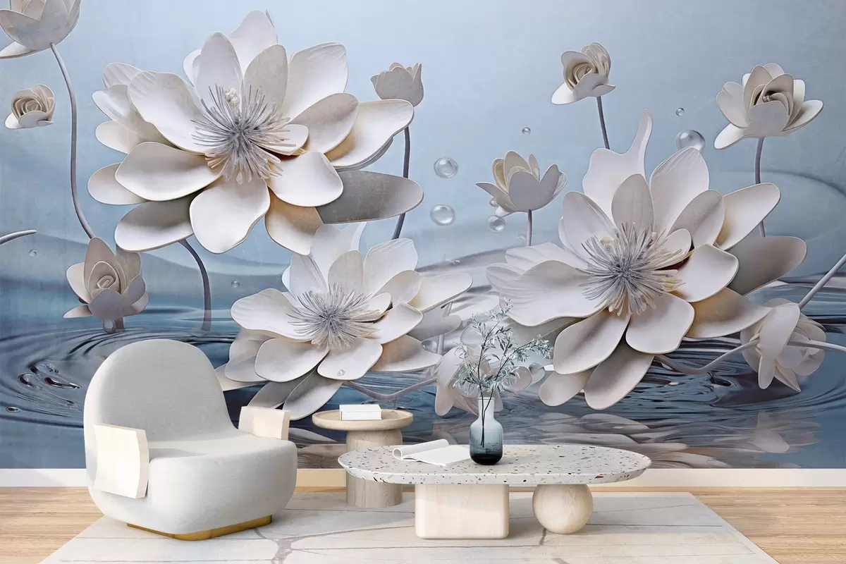 Fototapet Vita texturerade blommor med vattendroppar, reflektioner på vattenytan, ljusblå bakgrund, elegant design Nr. w09262