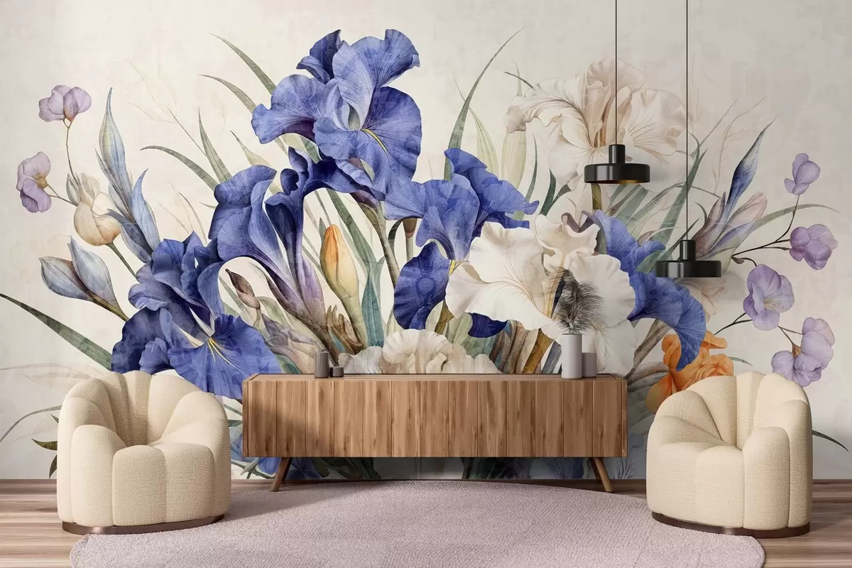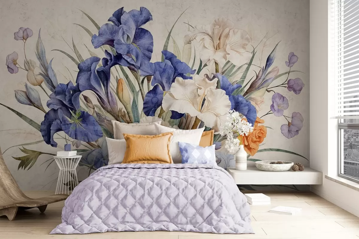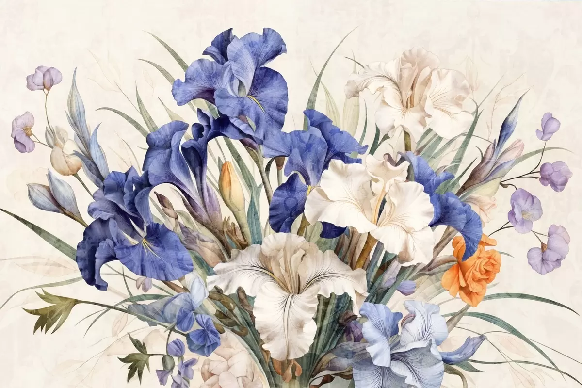 Fototapet Vintage texturerad bukett av lila iris, arrangerad med gröna blad och stjälkar, mot en mjuk bakgrund Nr. w09263