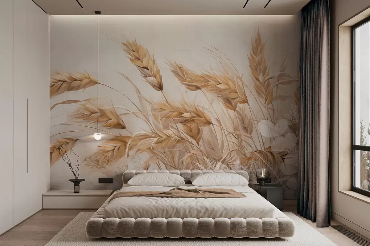 Fototapet Vetefält med beige kornax som vajar i vinden, mjuka och dämpade färger som skapar en känsla av värme Nr. w09264