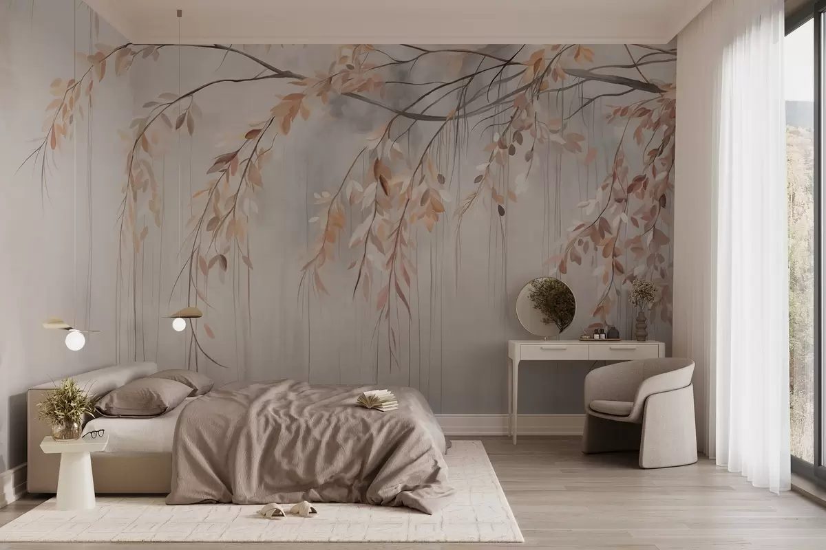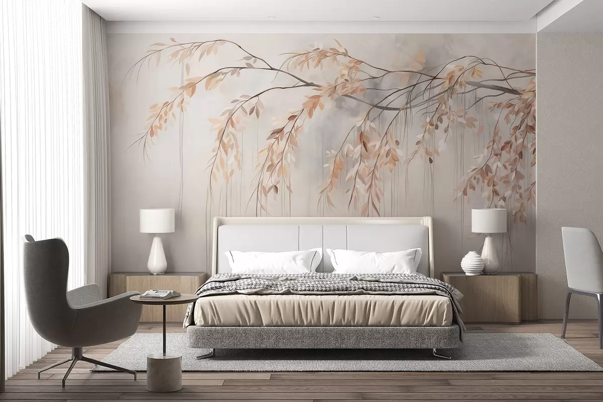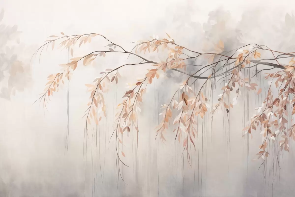 Fototapet En gren med ljusorange blad hänger ner, ljusgrå texturerad suddig bakgrund, mjuk och känslig stil Nr. w09265