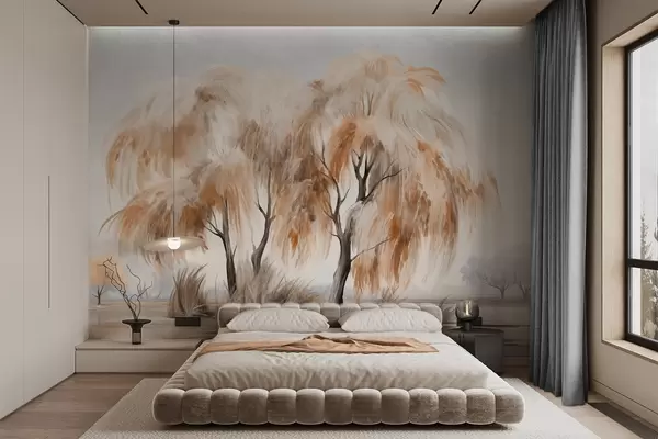 Fototapet Texturerade pilträd med bruna och vita blad på stranden av en sjö, med lite gräs runt dem, i en dimmig dag Nr. w09268