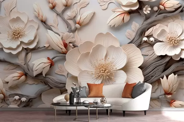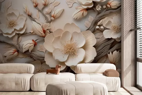 Fototapet Volymetriska blommor och grenar i ljusa toner Nr. w09272