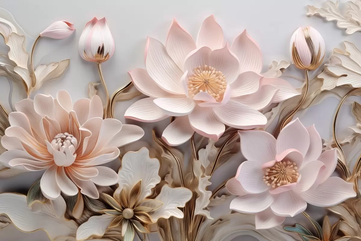 Fototapet Volymetriska rosa blommor med gula blad Nr. w09277