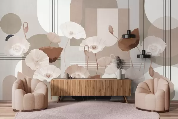 Fototapet Vallmo i vita och beige färger med geometriska former i bakgrunden, cirklar och bågar, minimalistisk stil, mjuka färger Nr. w09289