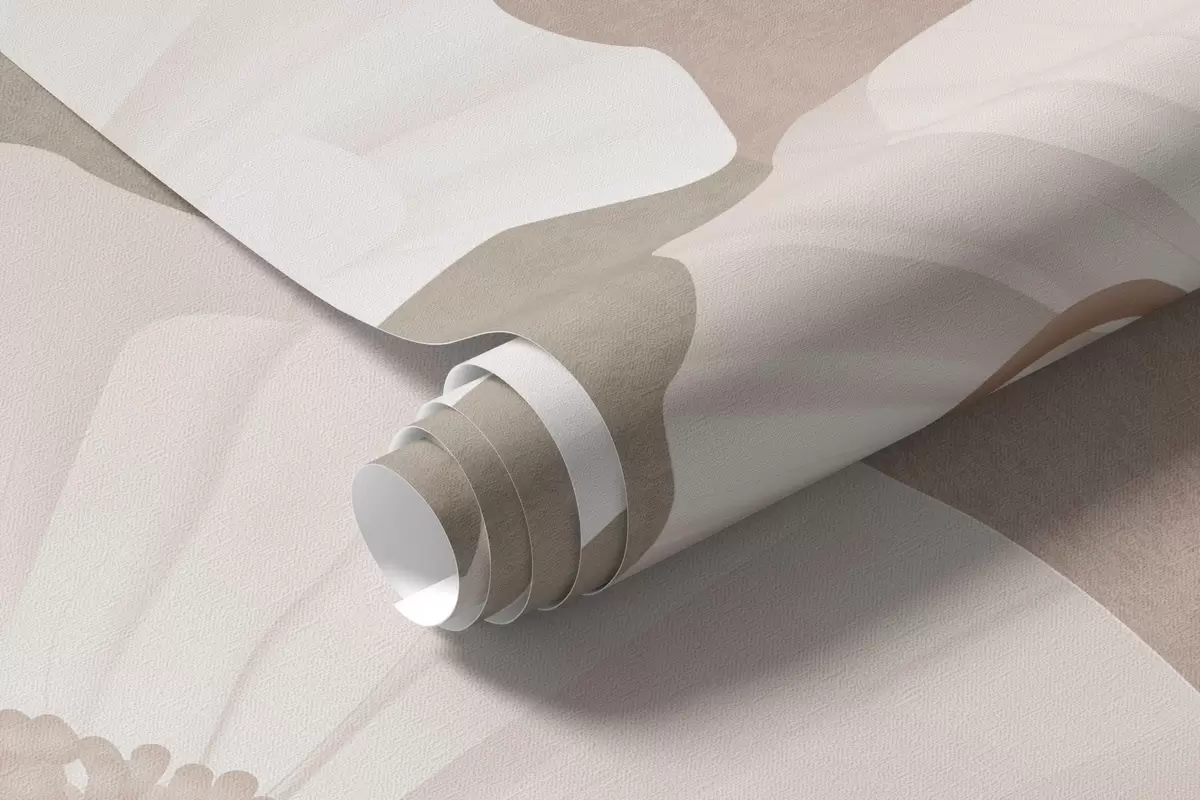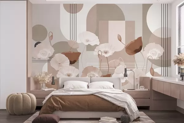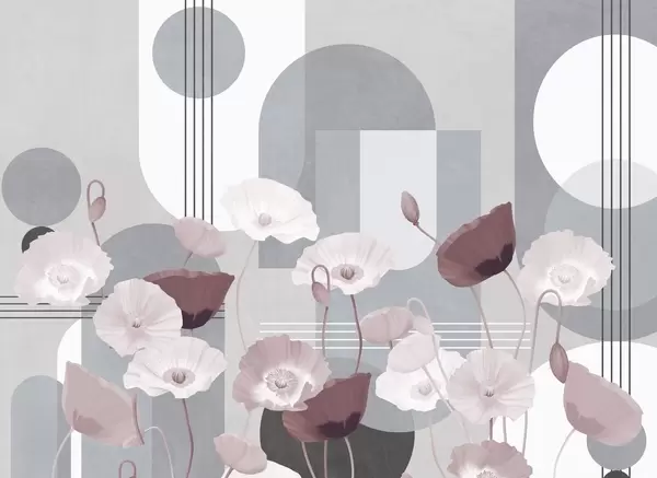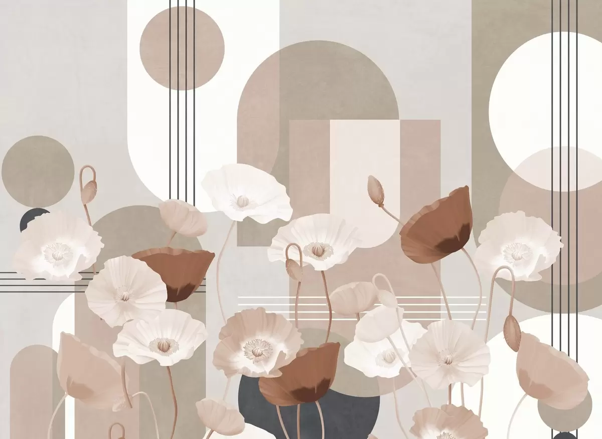 Fototapet Vallmo i vita och beige färger med geometriska former i bakgrunden, cirklar och bågar, minimalistisk stil, mjuka färger Nr. w09289