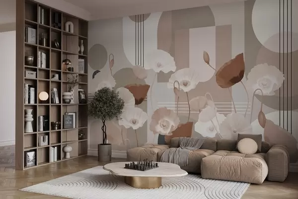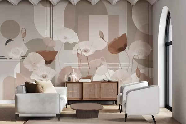 Fototapet Vallmo i vita och beige färger med geometriska former i bakgrunden, cirklar och bågar, minimalistisk stil, mjuka färger Nr. w09289