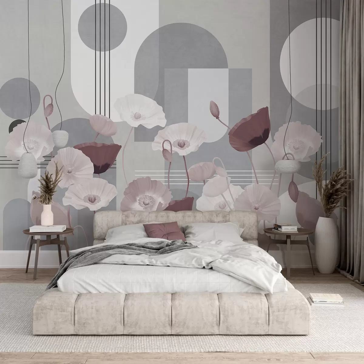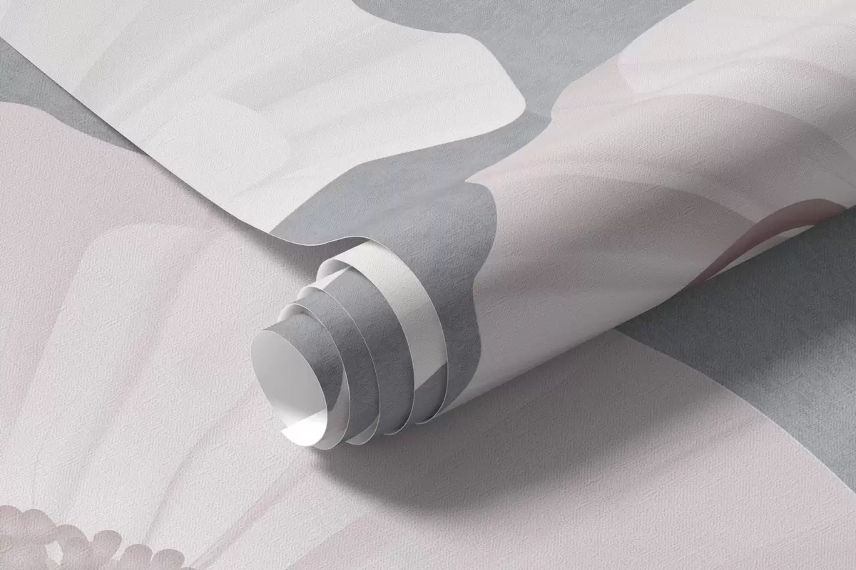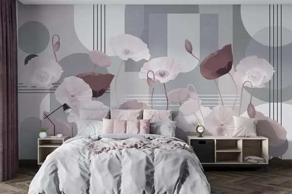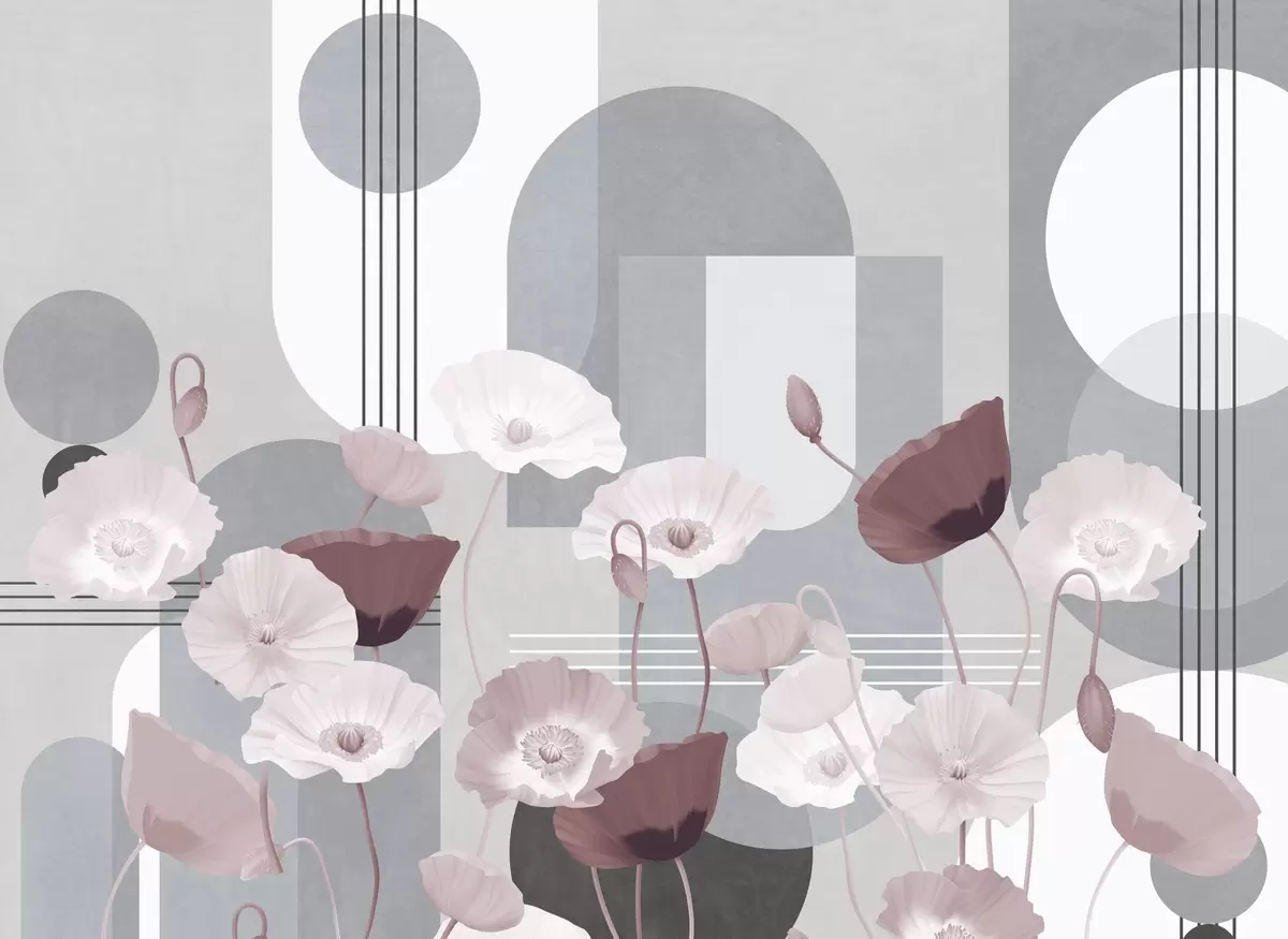 Fototapet Vallmo i vita och grå färger med geometriska former i bakgrunden, cirklar och bågar, minimalistisk stil, mjuka färger Nr. w09289v1