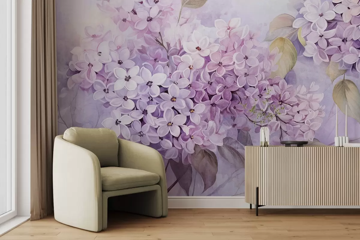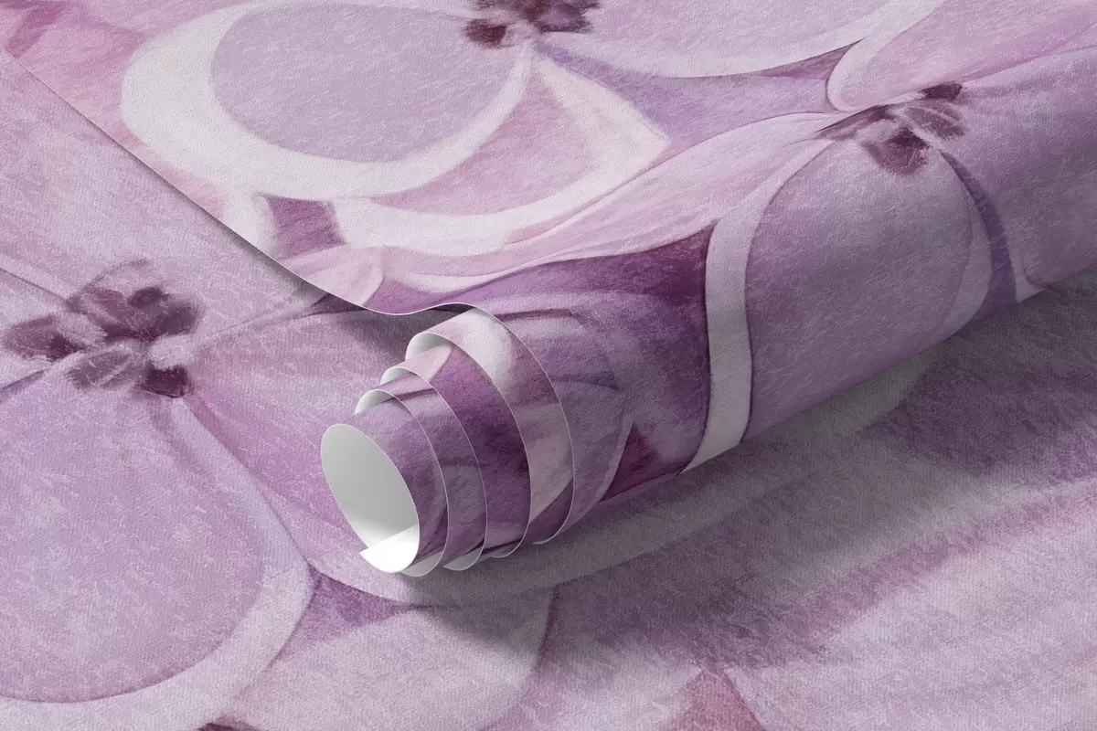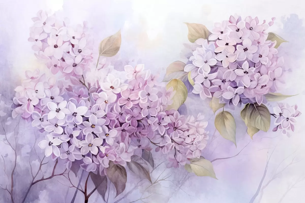 Fototapet Lila texturerade blommor med ljuslila kronblad, ljusgröna blad, akvarellstil, mjuka pastellfärger, fina penseldrag Nr. w09291