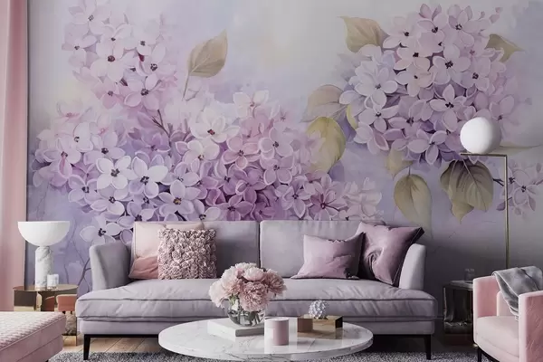 Fototapet Lila texturerade blommor med ljuslila kronblad, ljusgröna blad, akvarellstil, mjuka pastellfärger, fina penseldrag Nr. w09291