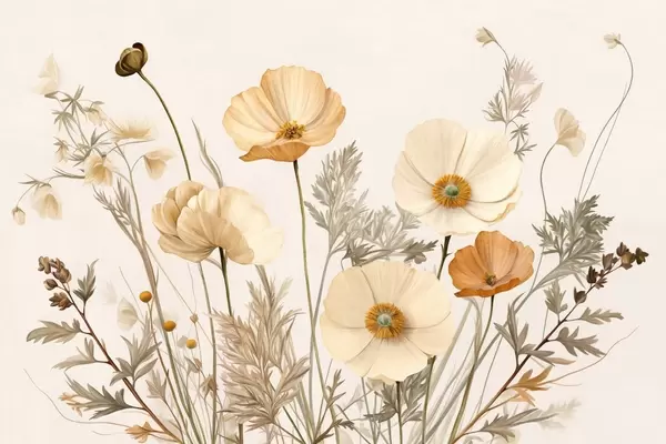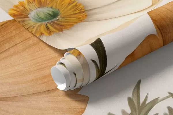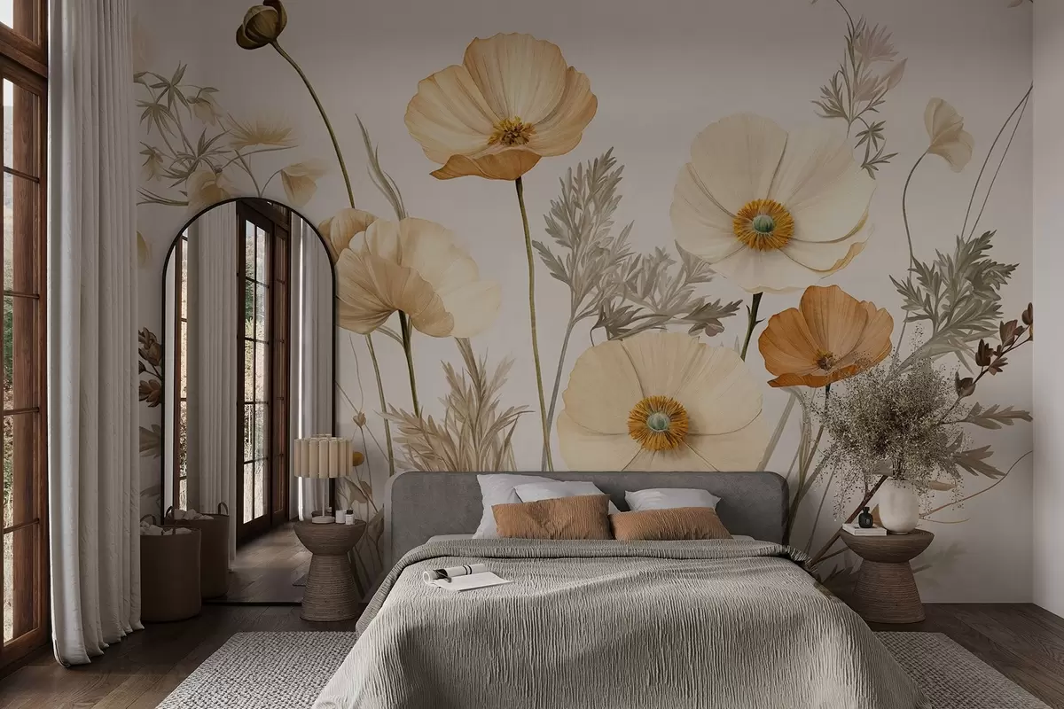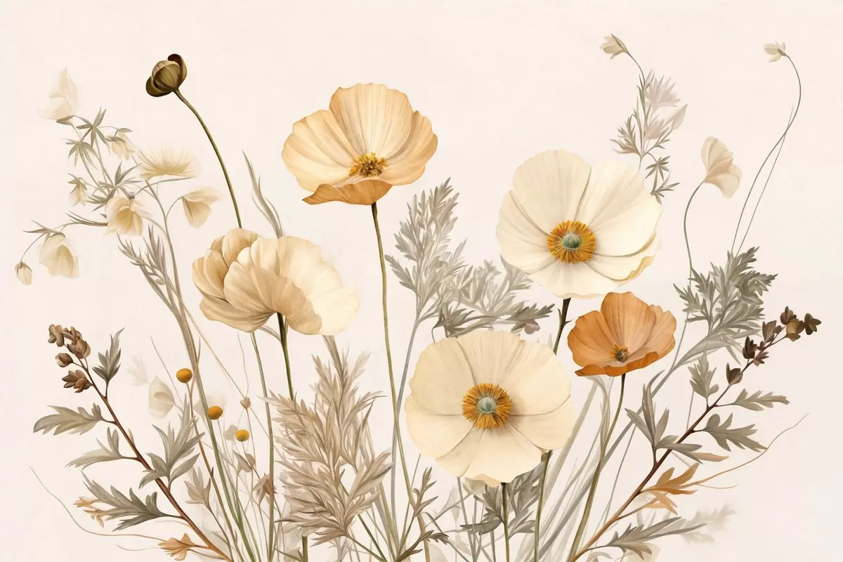 Fototapet Orange och vit vintage texturerad vallmo med tunna stjälkar och blad, ljus beige bakgrund, akvarellstil Nr. w09293